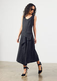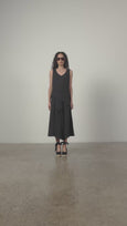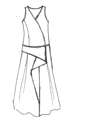 Semi-fitted sleeveless dress. Skims body. Slightly low waist with peplum & waterfall in front skirt. Curved v Neck. Back length from top shoulder point 127cm