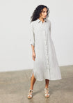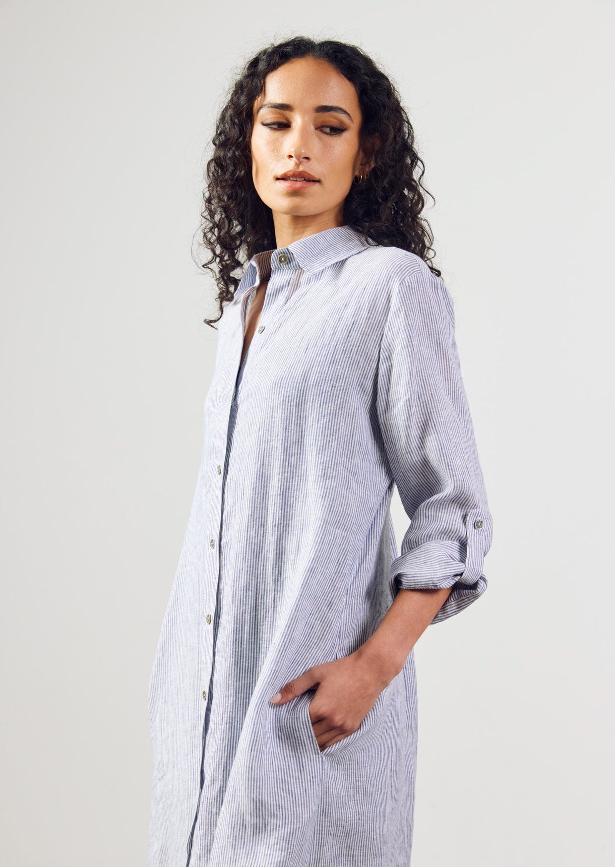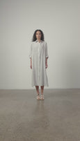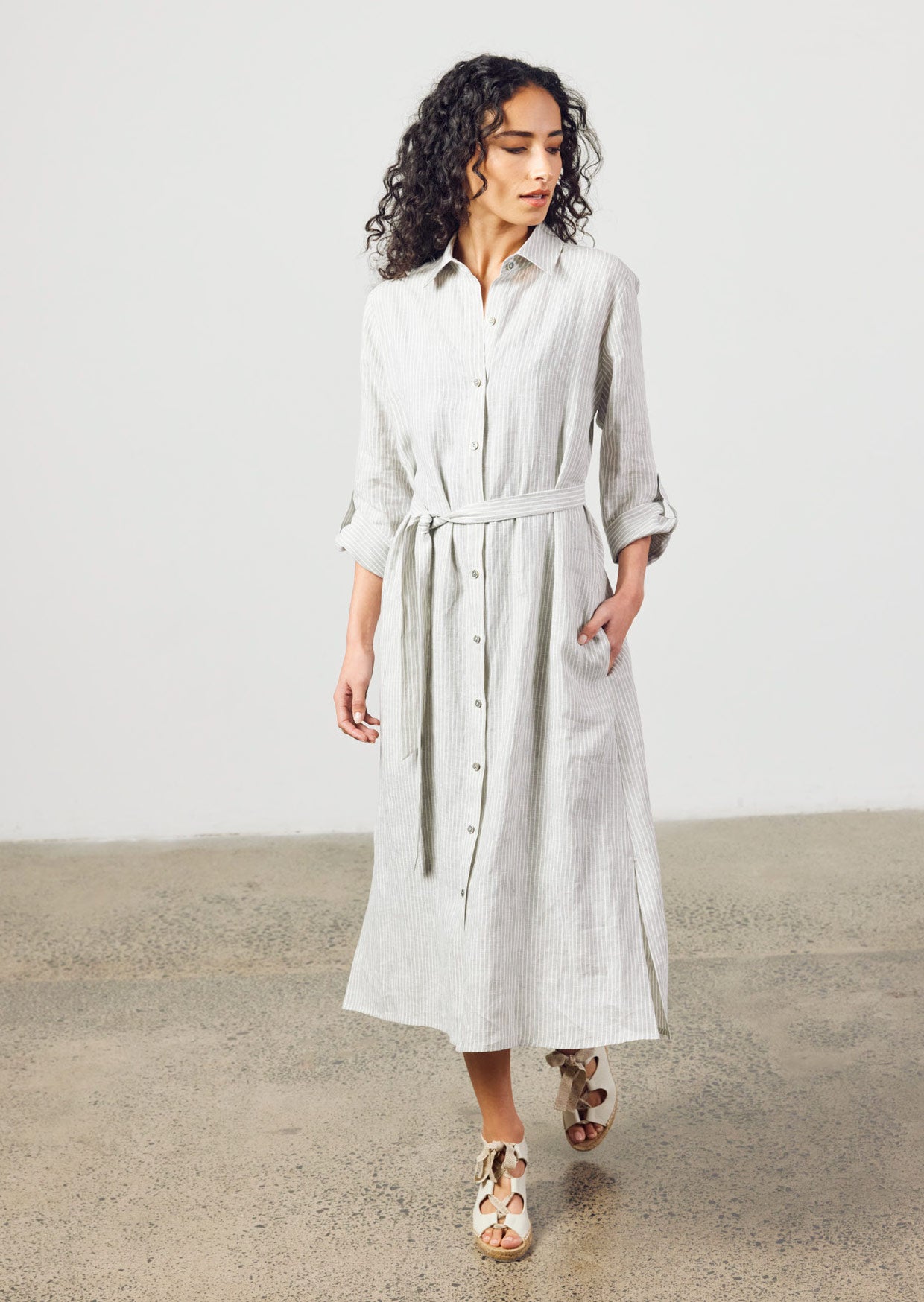Shirtdress with belt. Body skimming slightly A line shape. Regular shirt collar on stand. Roll up ¾ sleeve secured with tab & button. Self belt. Back length 123 cm.
