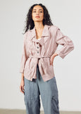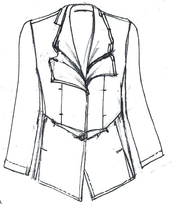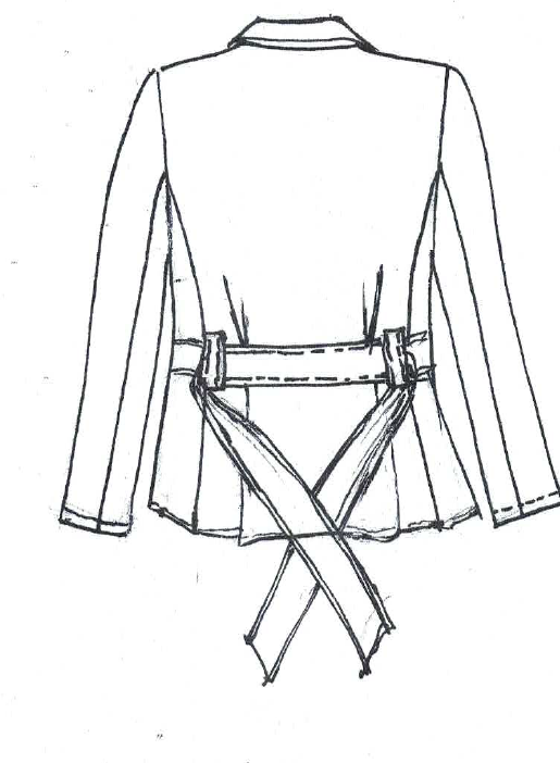 Unlined jacket with tie belt fluted collar, diagonally folded & tucked front panels. Full length roll up sleeves. Back length 127 cm