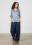 Flattering rounded V neck top with split at centre front seam & splits in side seam. Rounded shirt tails. Below length sleeves with tuck. Loose relaxed fit. Back length 62 cm.
