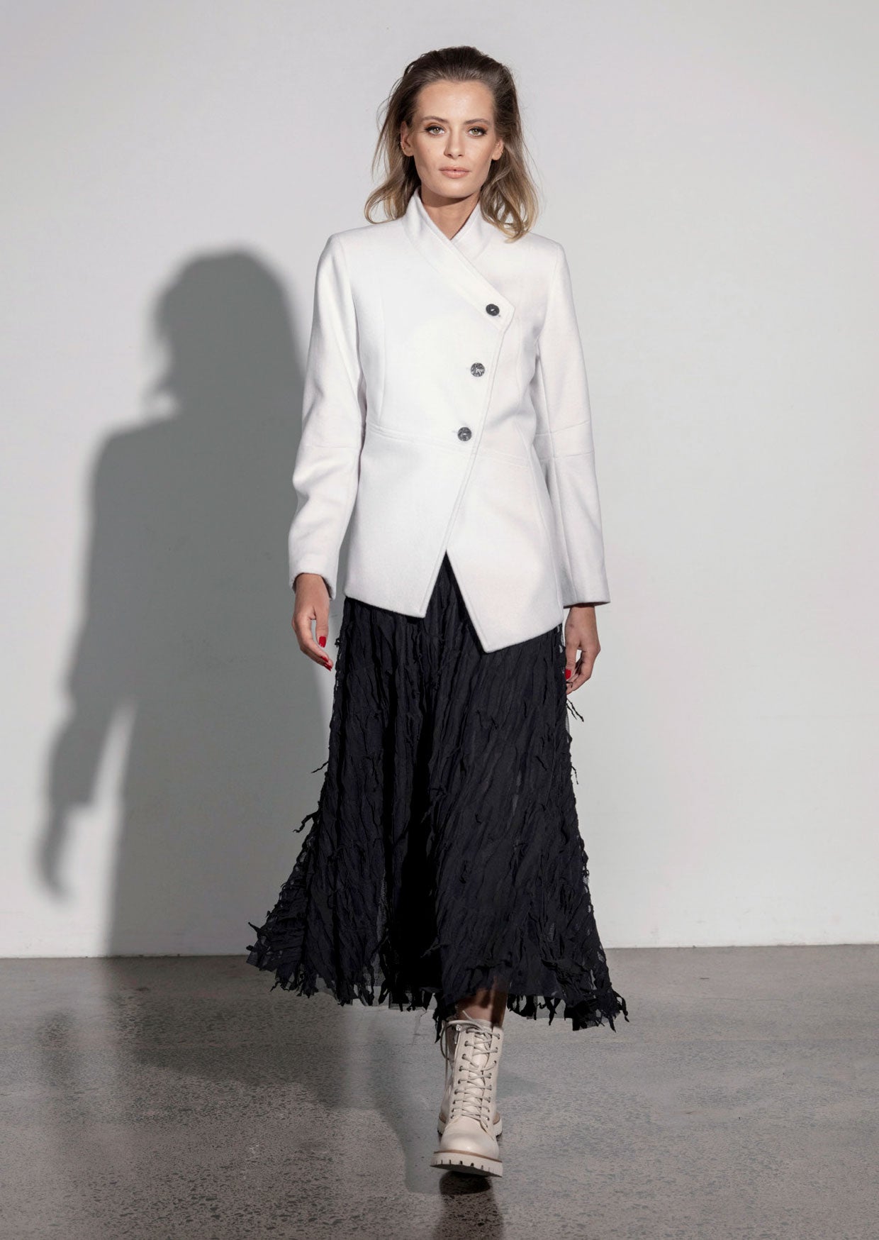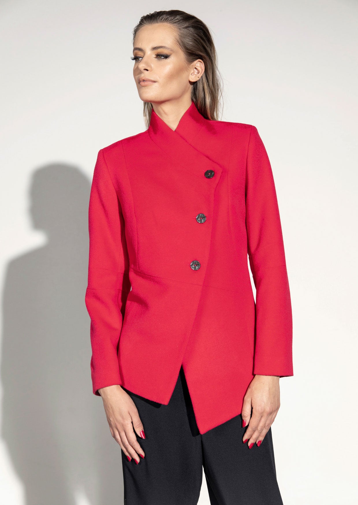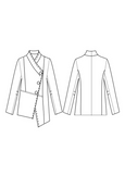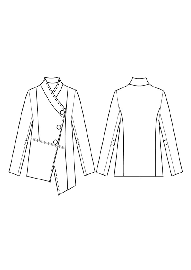 Fitted jacket with shaped panel seams. Fully lined with Italian stretch lining. Angled front interest and shaped panel seams. Three metal button angled front closure. Full length two piece sleeves with darts. Angled front hem.