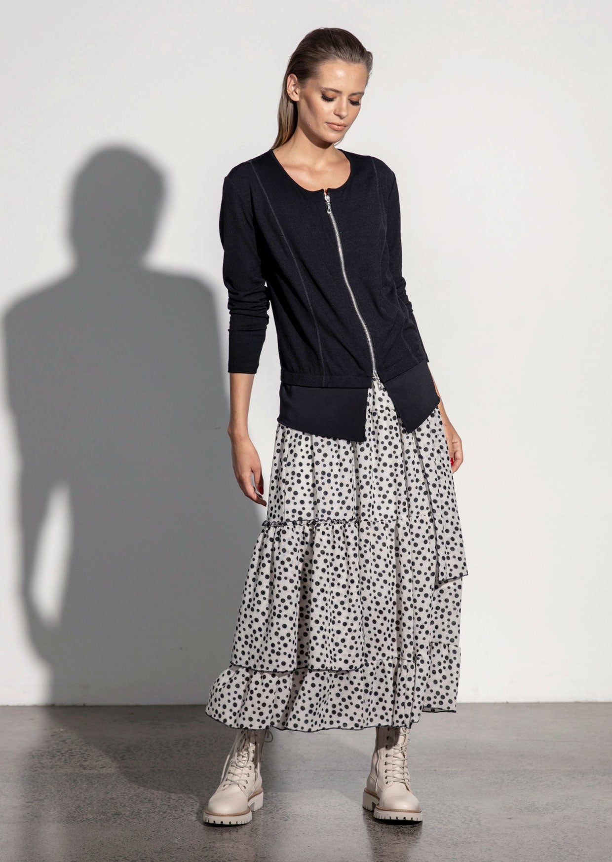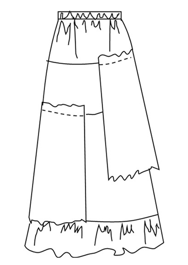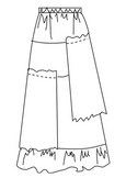 Layered lined skirt with elasticated waistband. Ankle length. Gathered tiers attached.