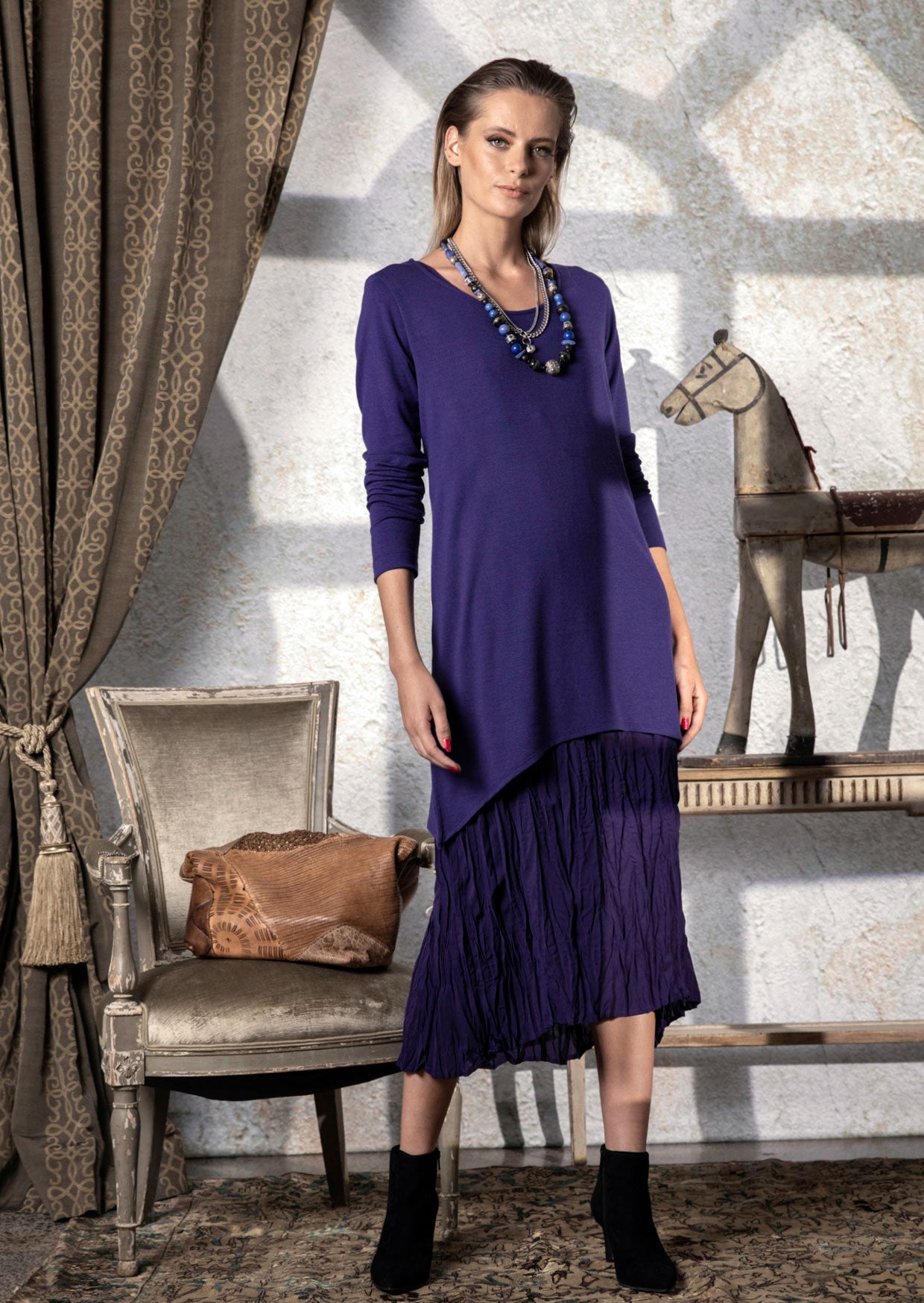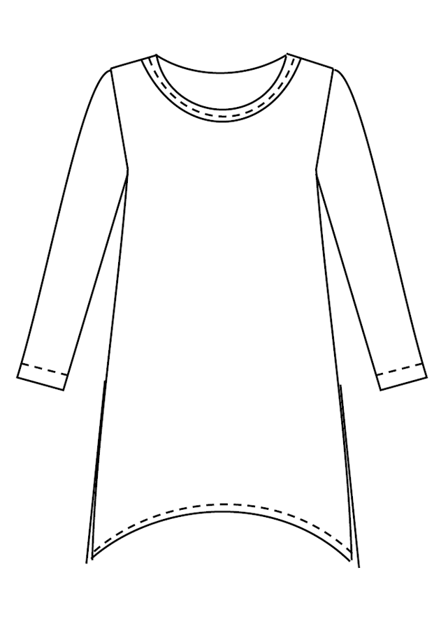 Thigh length top with scoop neck and side splits. Hi-lo hemline scoops down at the sides. Full length sleeves.