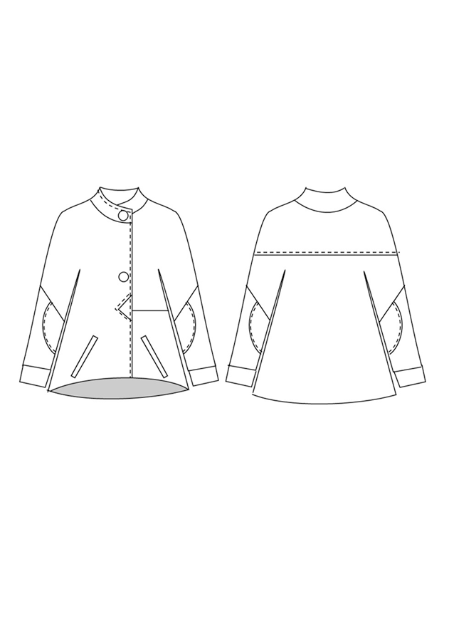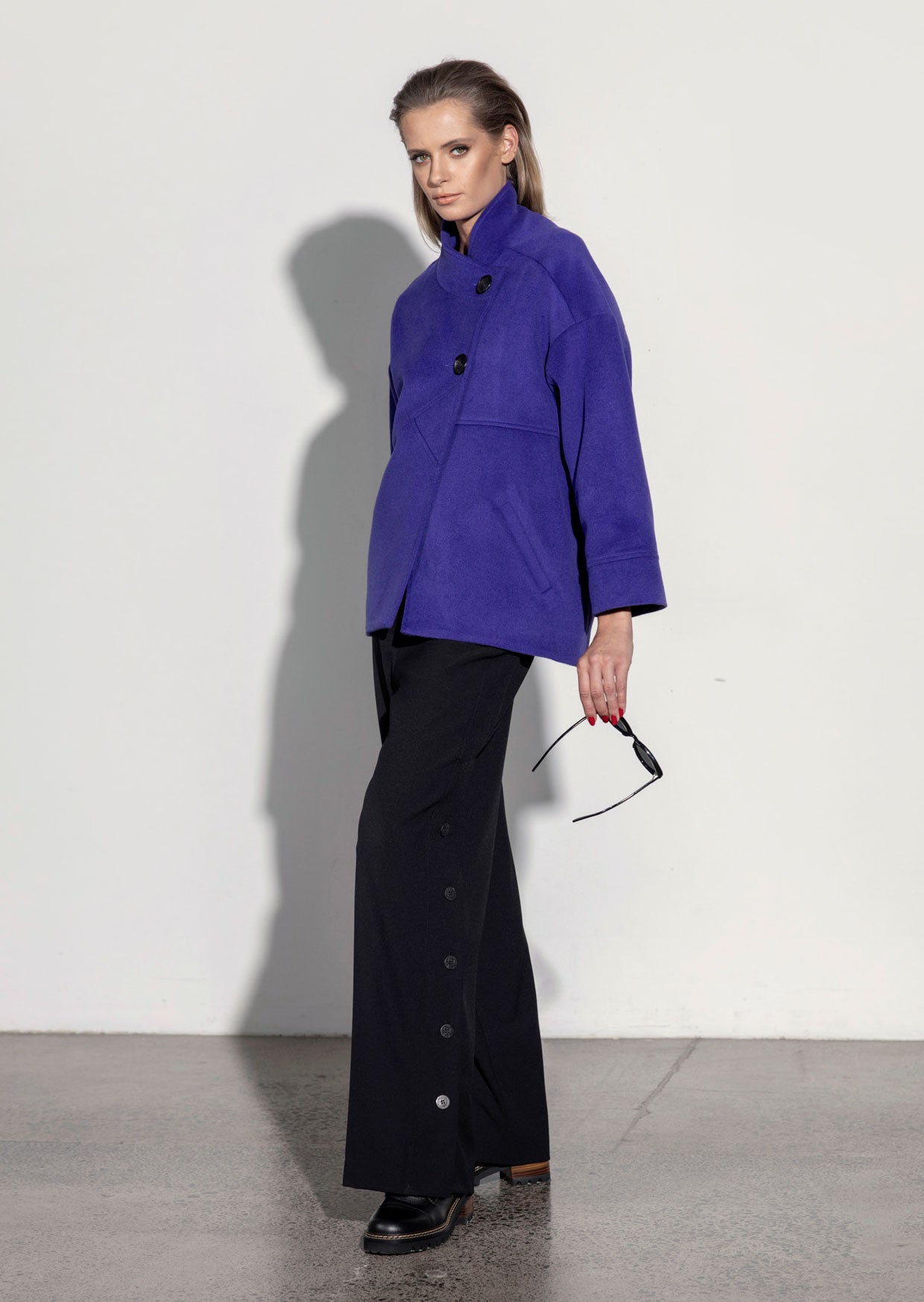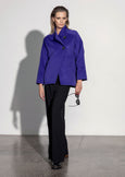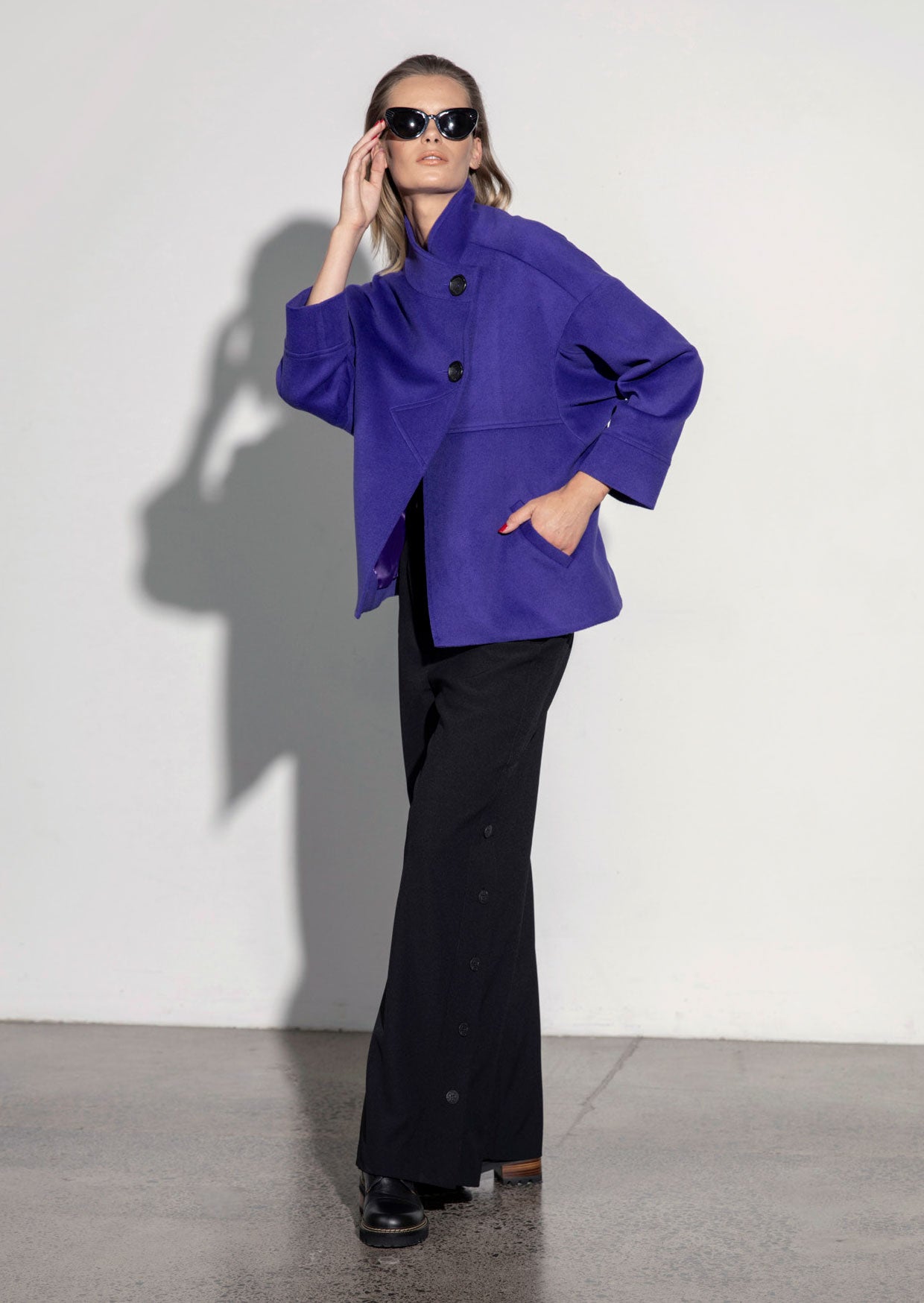 Relaxed oversized fit jacket with high low scooped hem. Dolman 3/4 length sleeve with gussets and cuff. Inset triangle panel. Single welt pockets. French metal 'whirl' buttoned front closure.