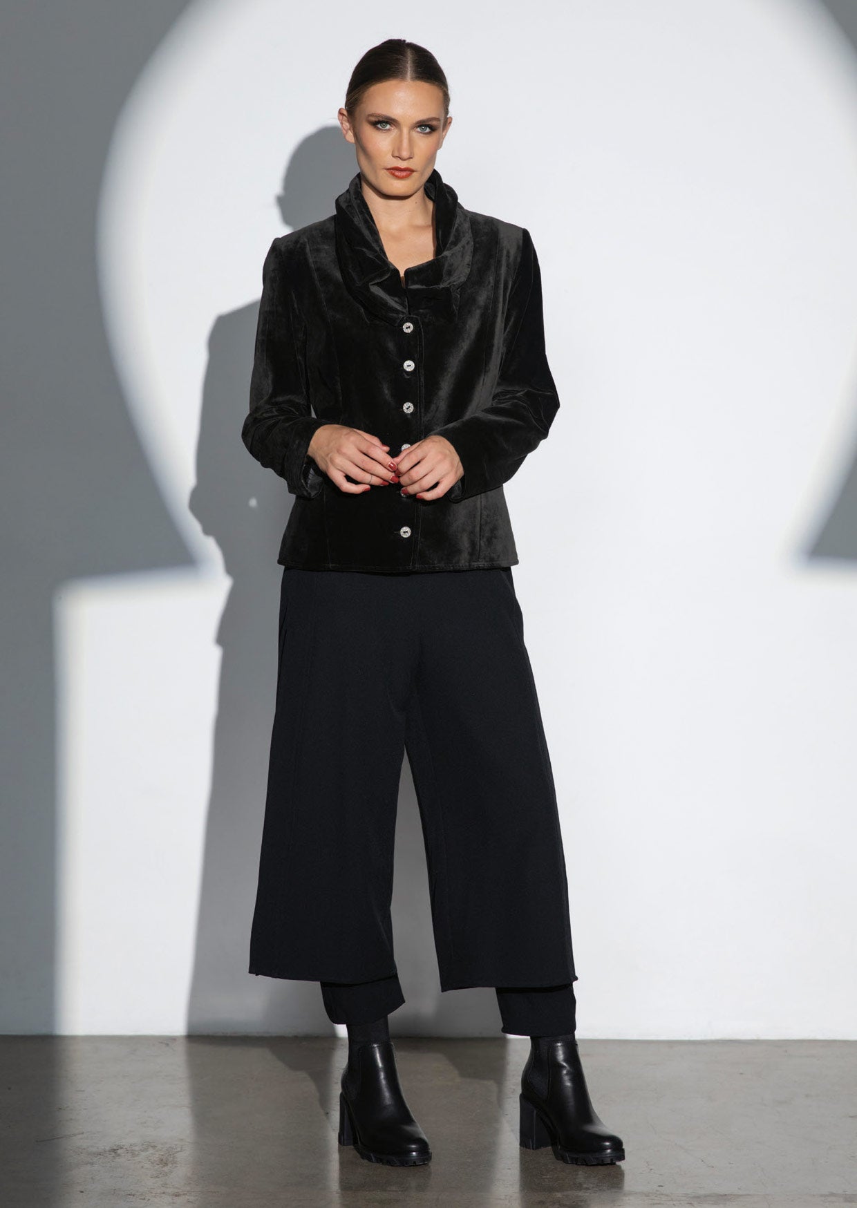 Tailored, fully lined jacket with two piece full length sleeve. Shaped panel seam, singlet welt pockets. Origami style puff collar detail. French metal button front closure. Back has curved panel seams.