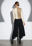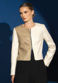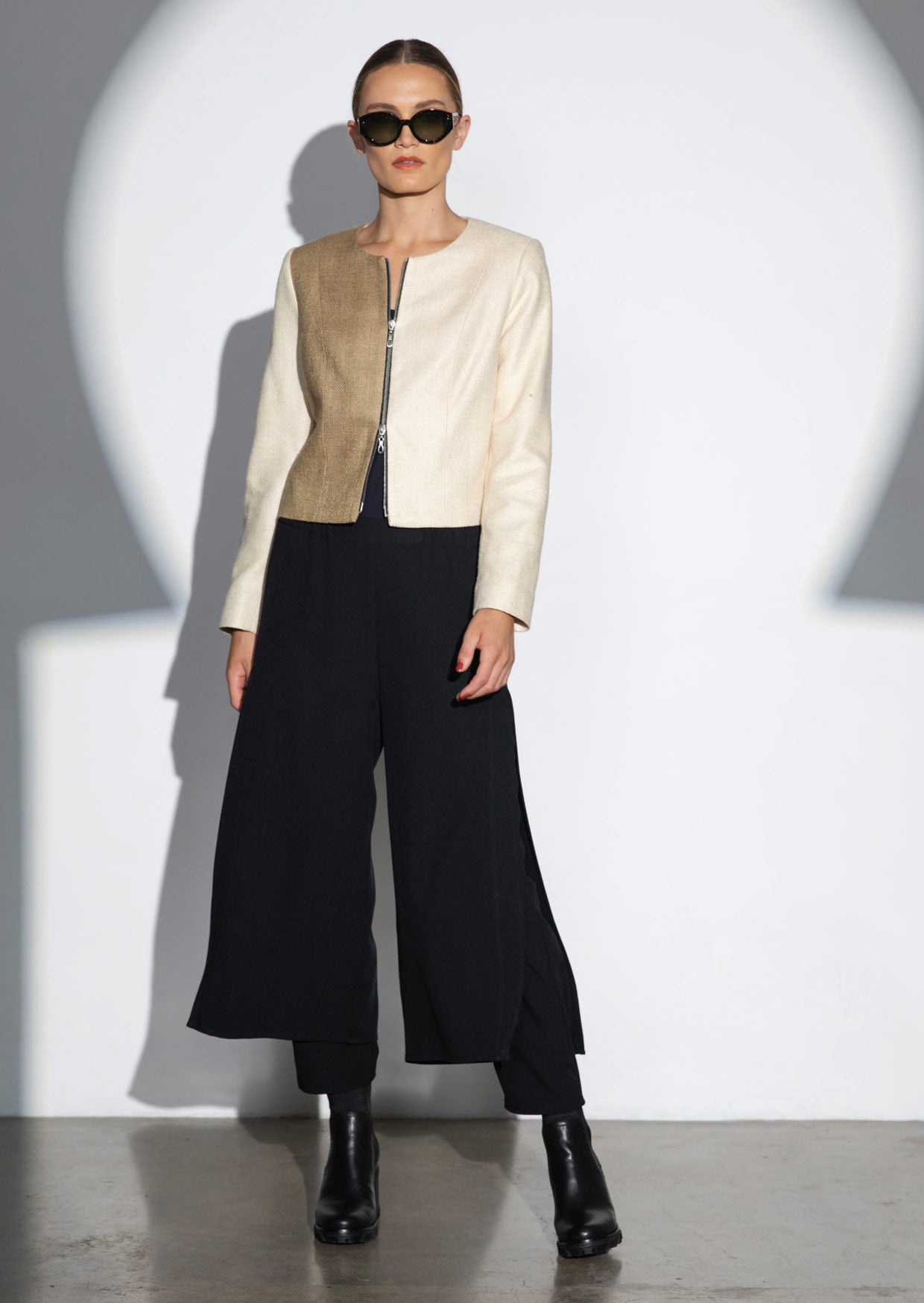 Tailored crop jacket with princess panel seams. Round neck with metal zip for front closure, fully lined, full length sleeves. Back is bias cut for added comfort.