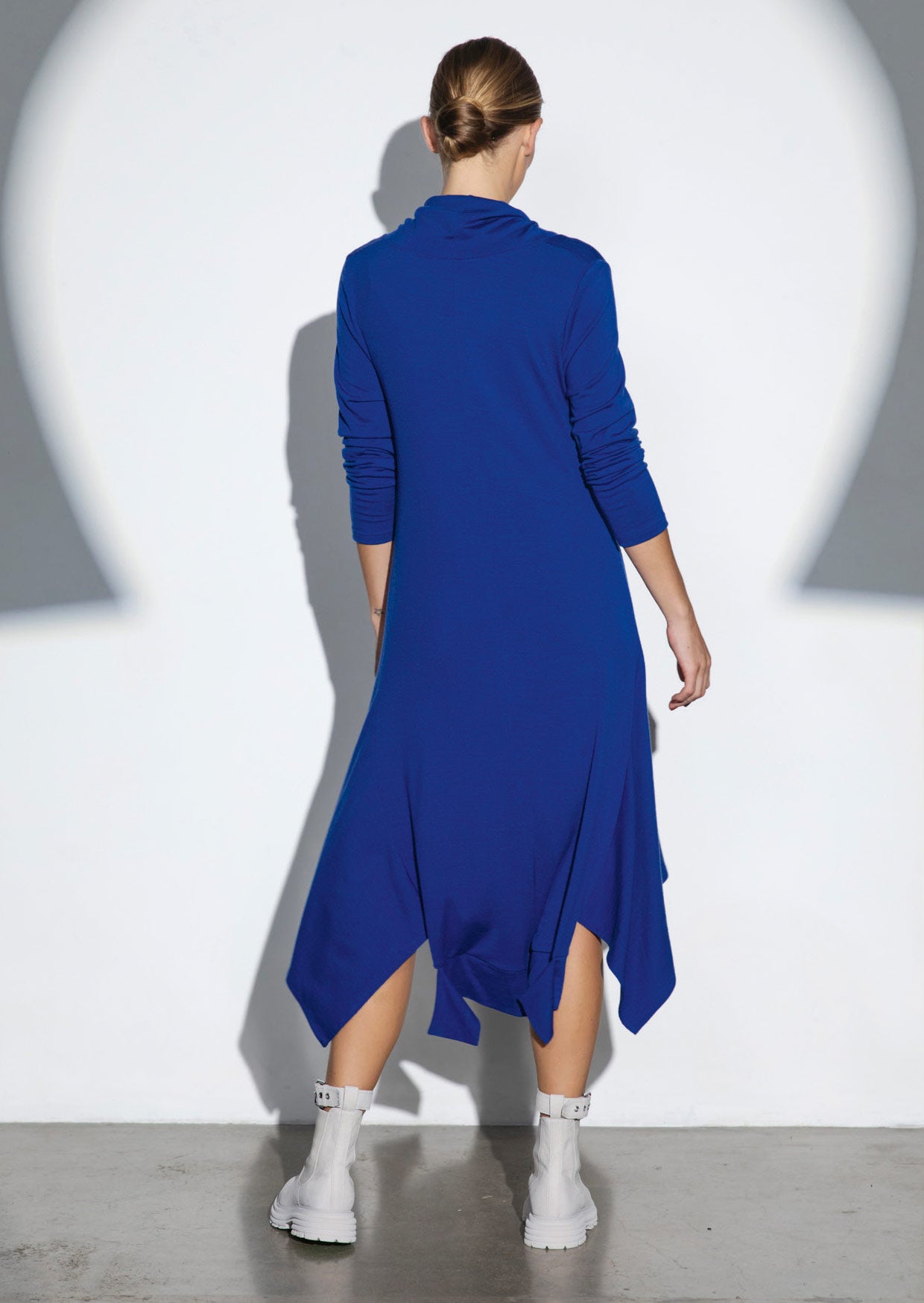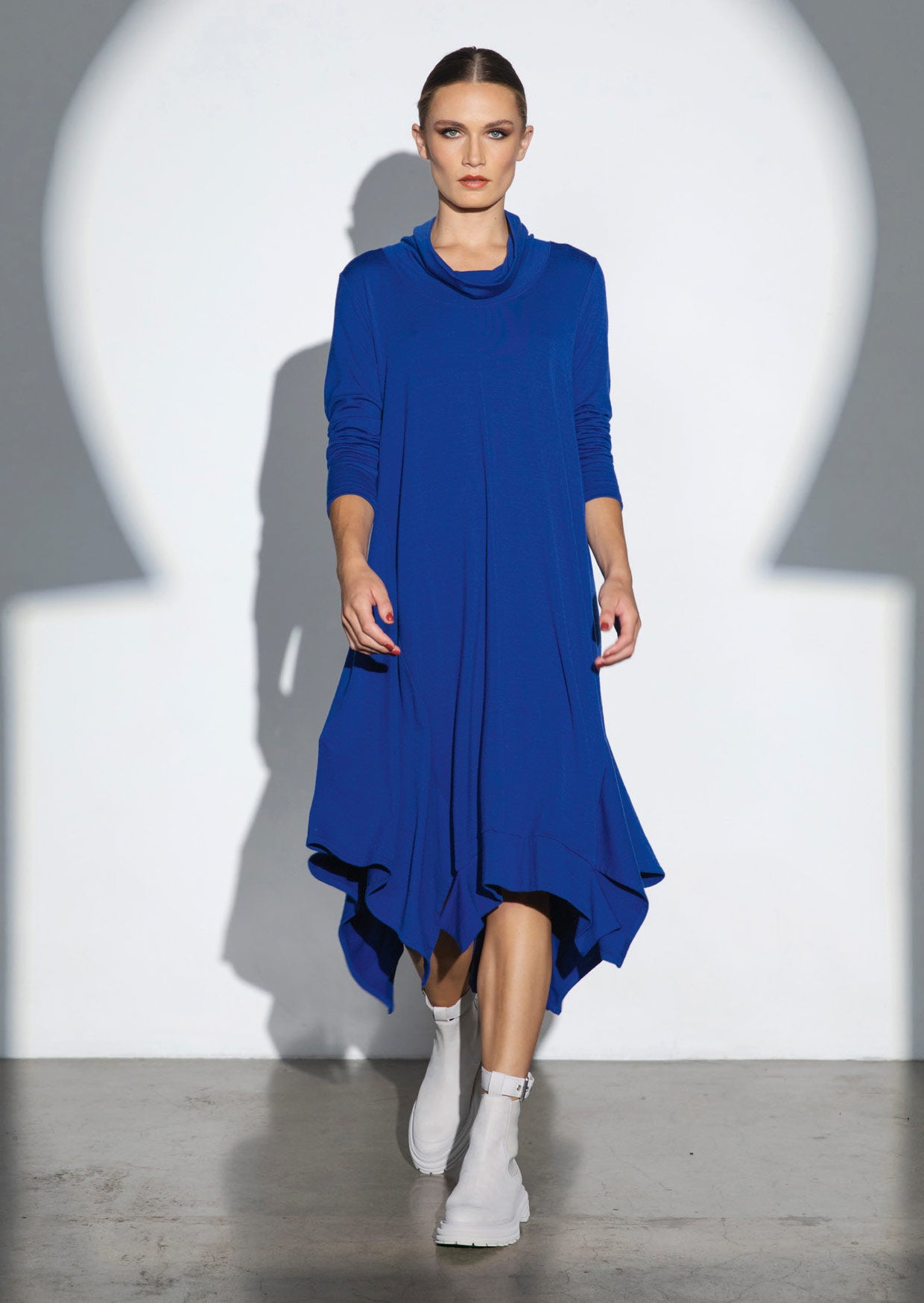 Midi length, hanky hem knit dress. Full length sleeves and cowl neck