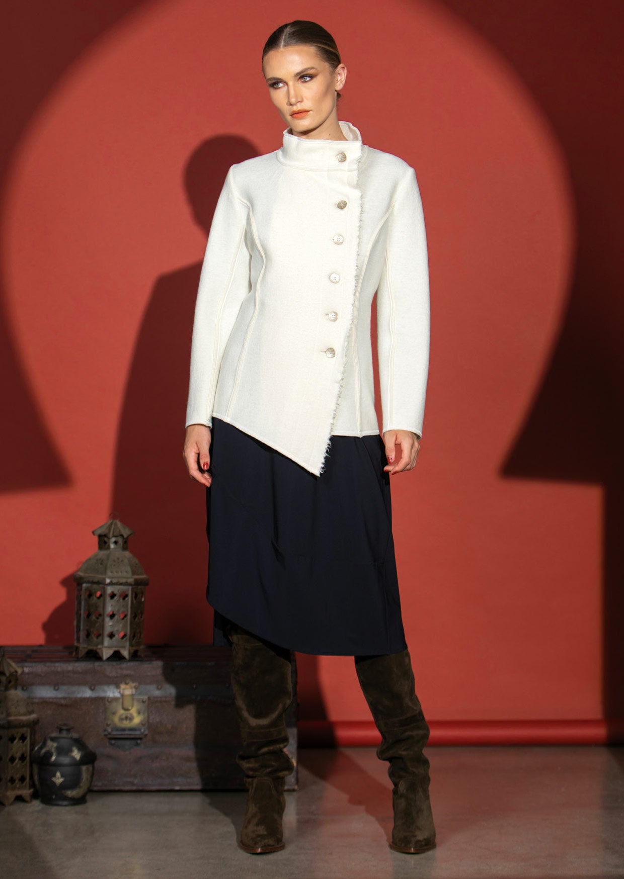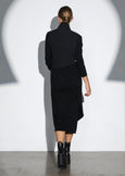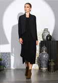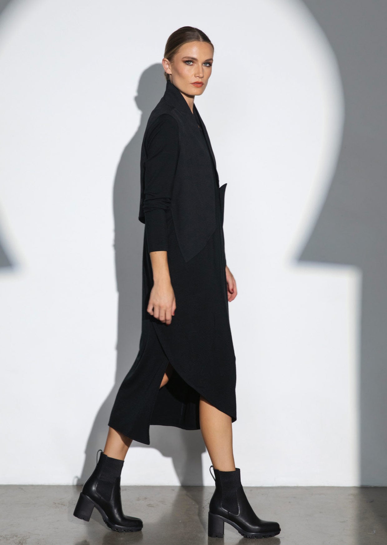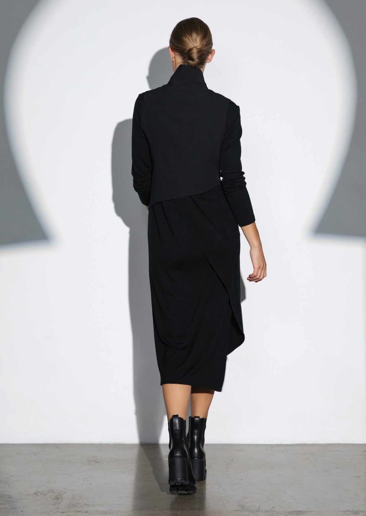 Relaxed fit, midi length knit dress, full length sleeves, asymmetrical wrap detail skirt. Features separate waistcoat with angled hem and asymmetrical collar and lapels.