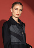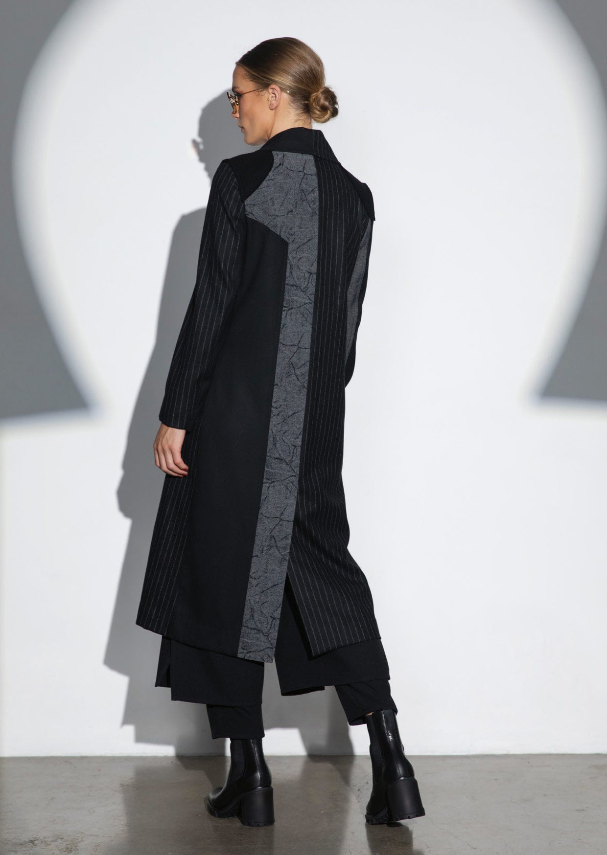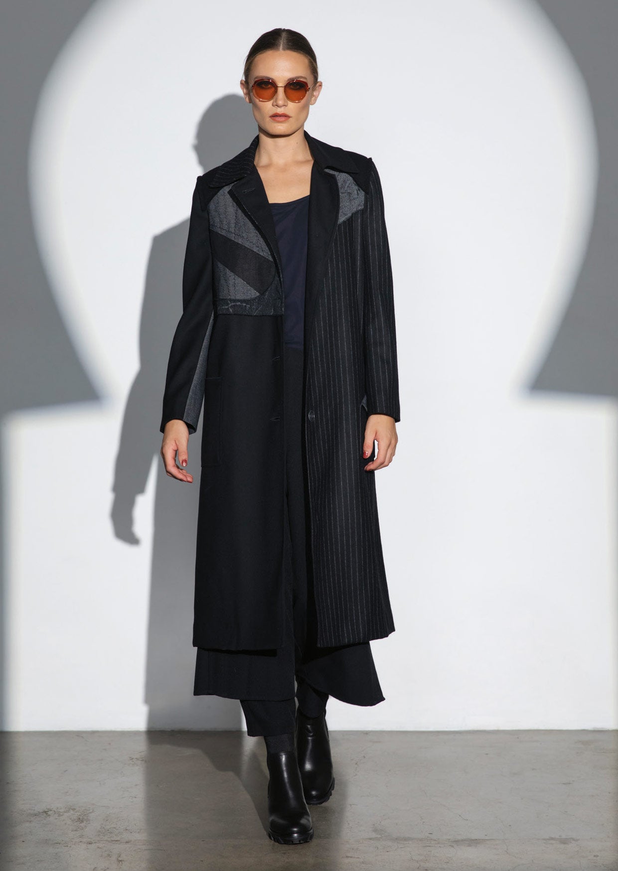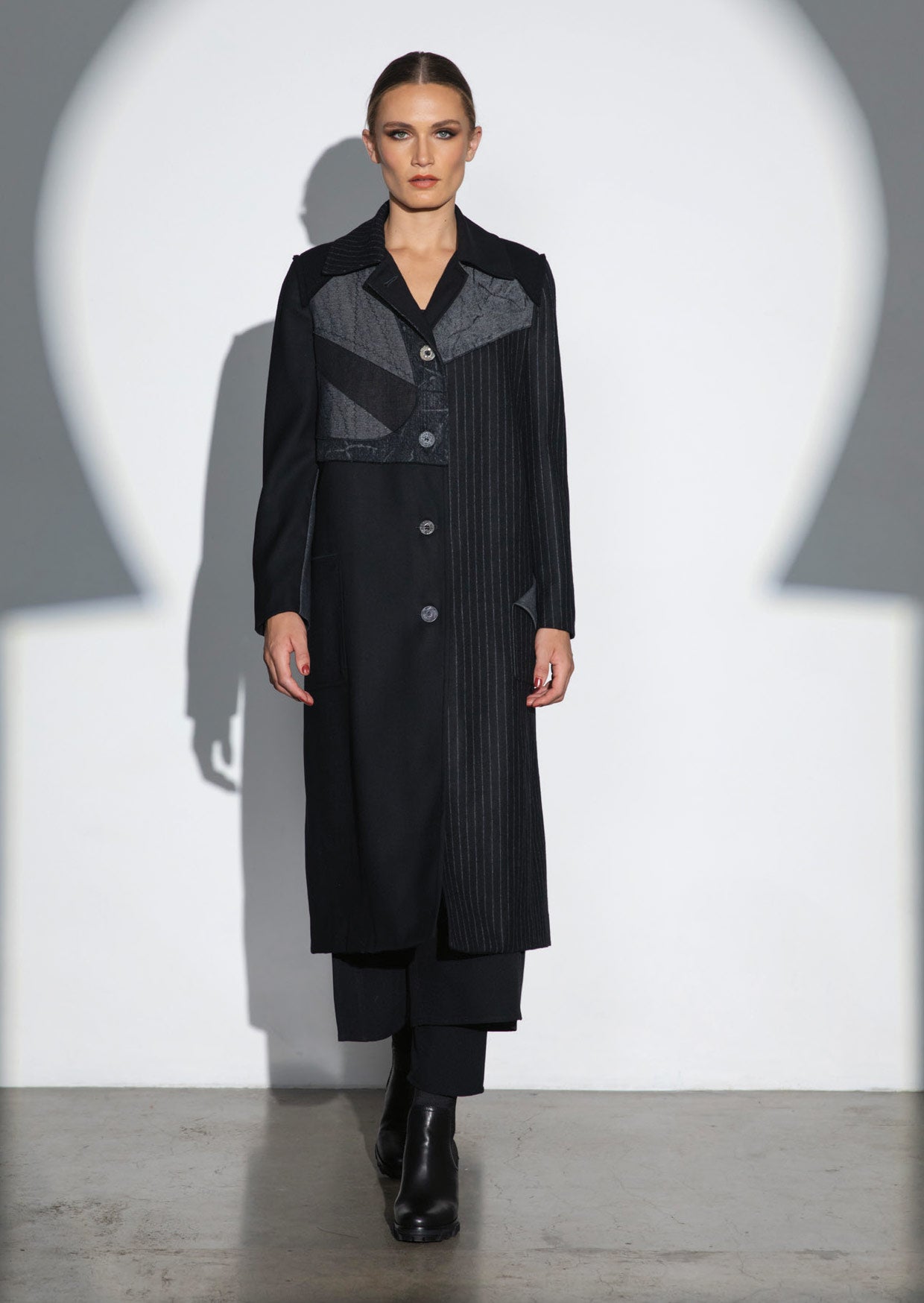 Tailored midi length lined patchwork coat. Collar and lapel. Features assorted French metal button front closure. Two piece full length sleeve, patch pockets.