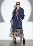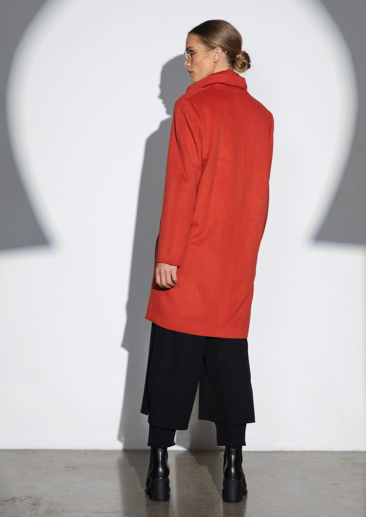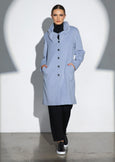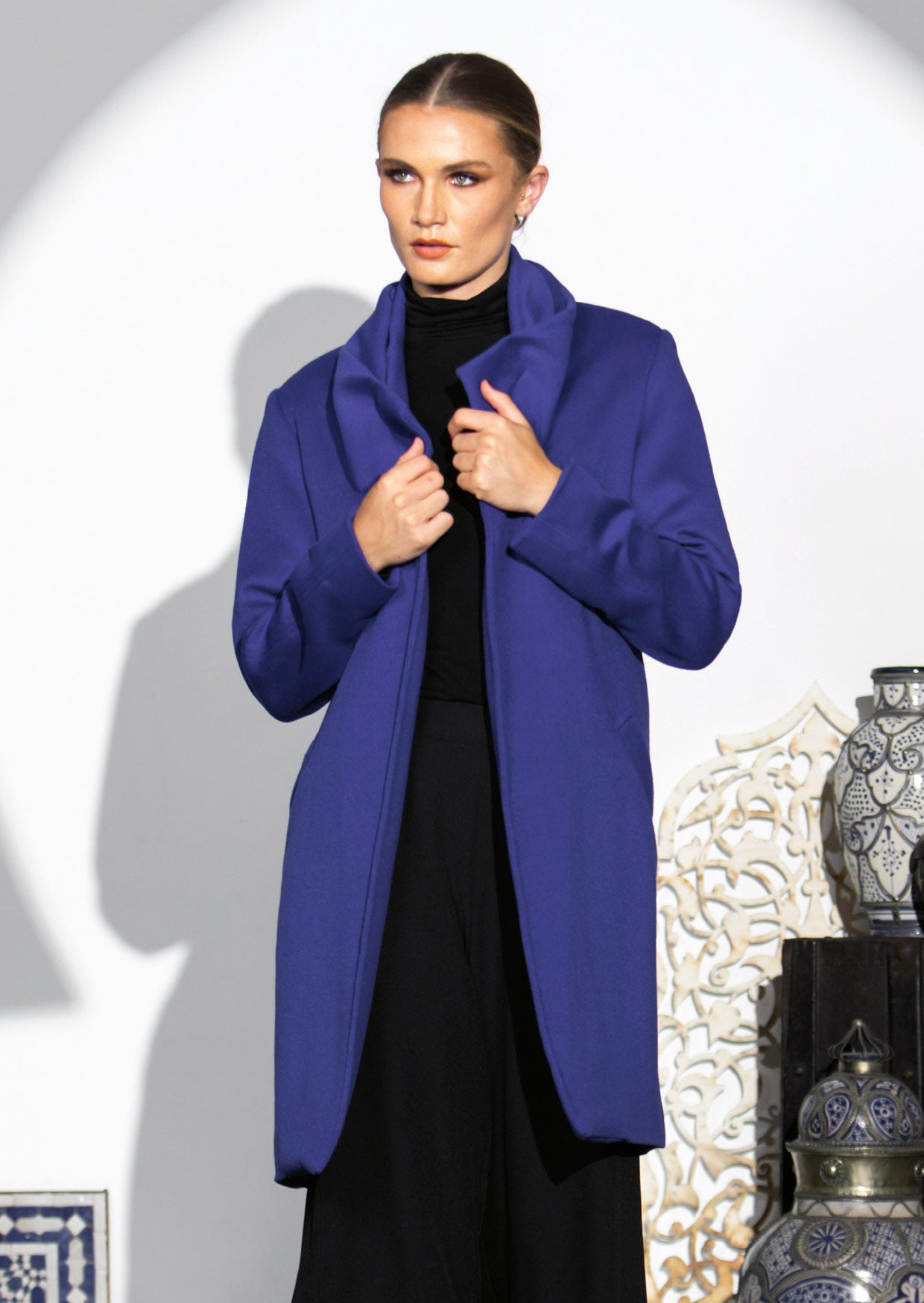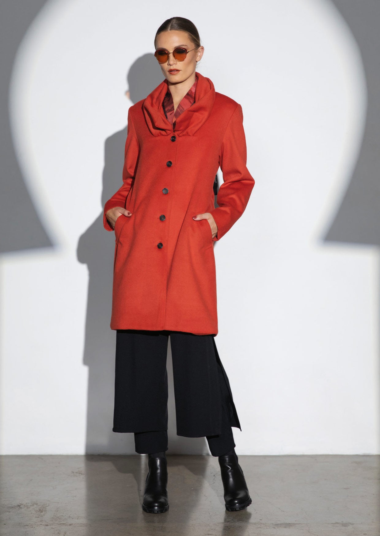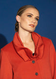 Tailored car length, fully lined coat with two piece, full length sleeve. Angled welt pockets, origami puff collar detail. French metal button front closure.