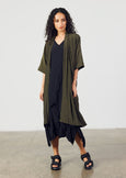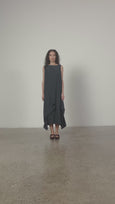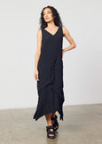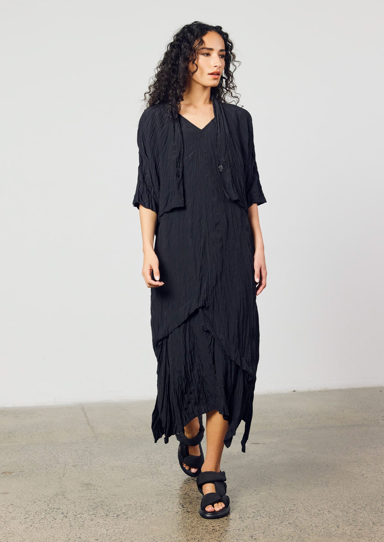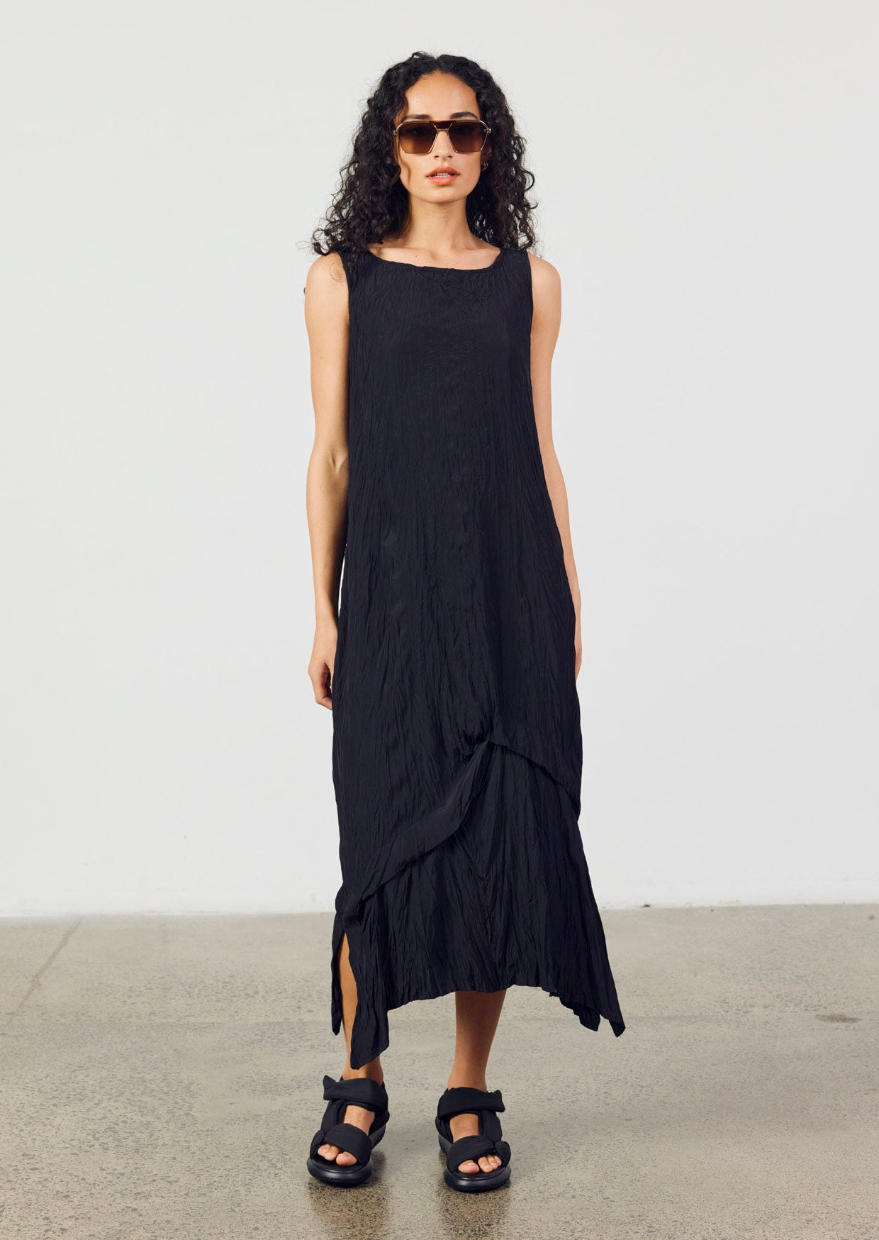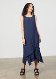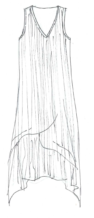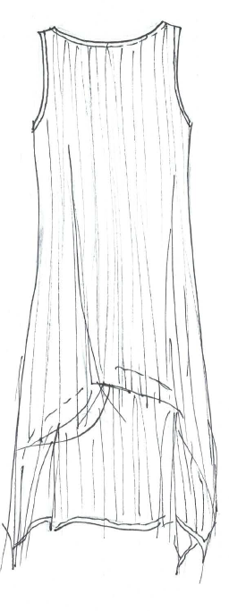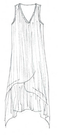Sleeveless vertically crinkled dress is reversible. V neck at front or back/boat neck at front or back. Diagonal tucks front & back in skirt create interesting hemline. Great travel & layering piece with 6663-1 pant, 6674-1 & 6702-1 jackets.