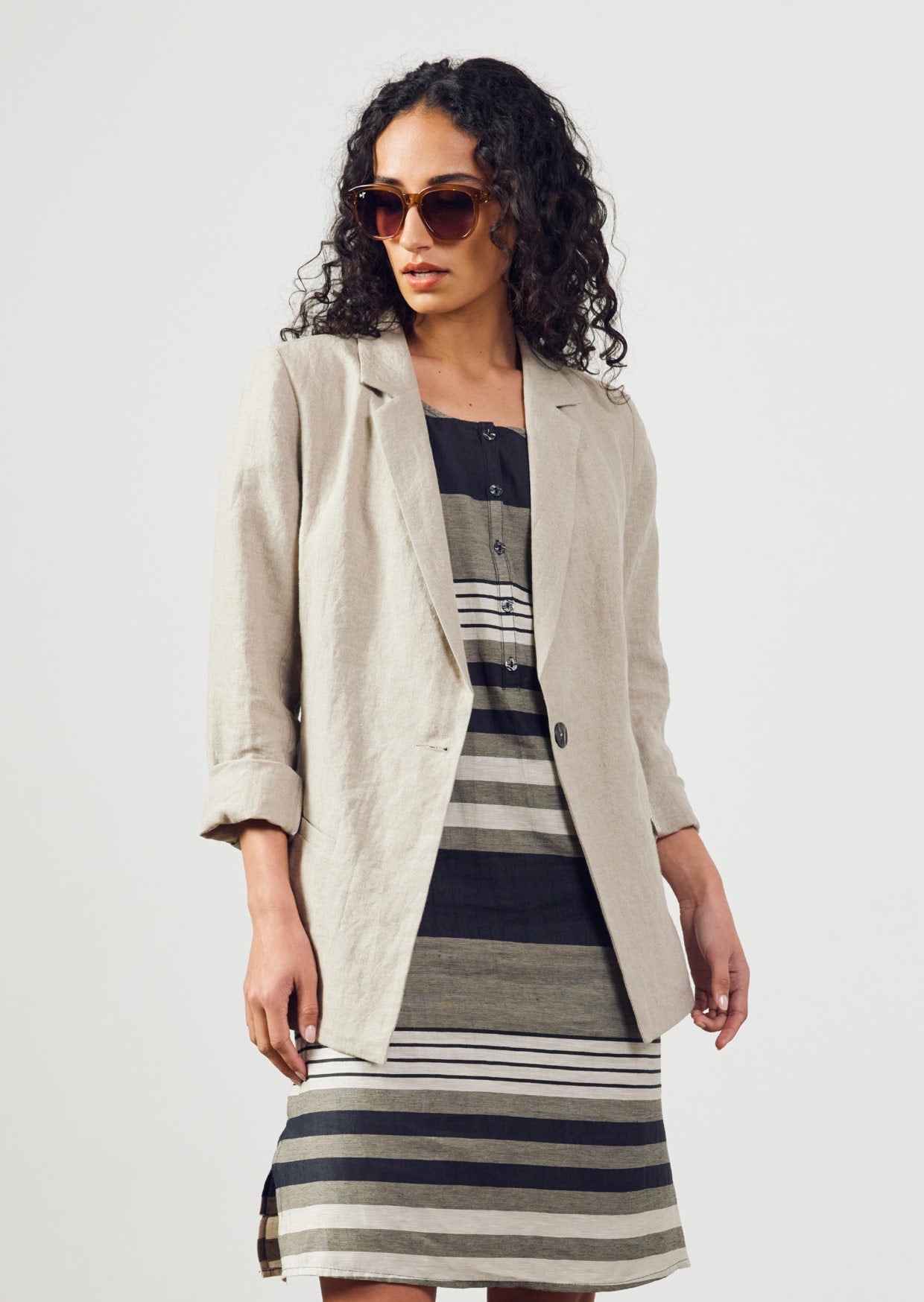 Fully lined one-button blazer. Welt pockets, two piece sleeve. Back length 70 cm