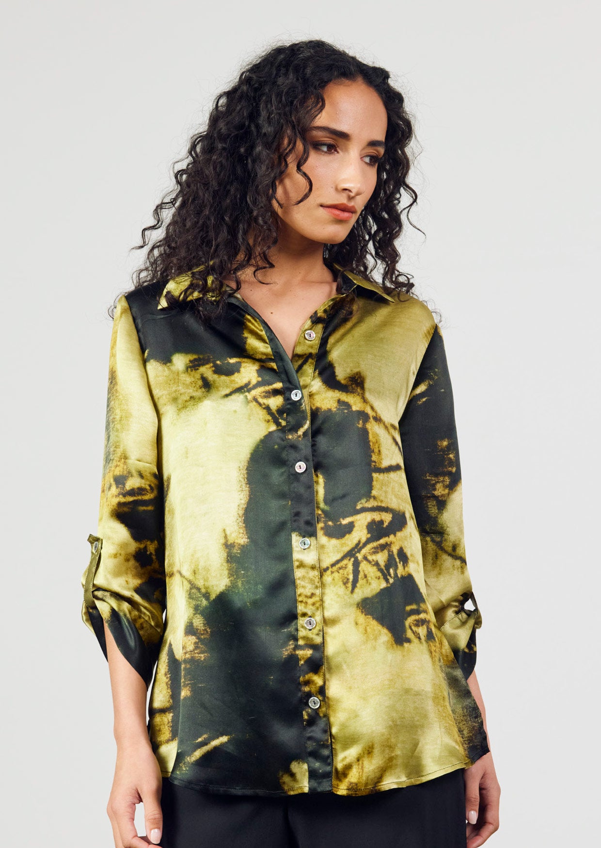 Classic shirt with collar on stand. ¾ sleeve with roll up cuff with tab. Front placket. Splits in side seam shirt tail hem. Back length 69 cm
