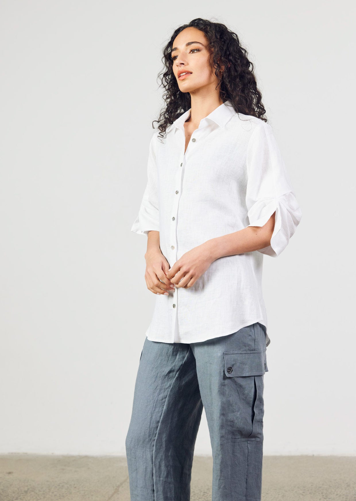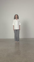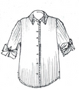 Regular shoulder. Van-dyked collar. Perpendicular, stripe placket & origami “fortune-teller” sleeve. Back length 73 cm.