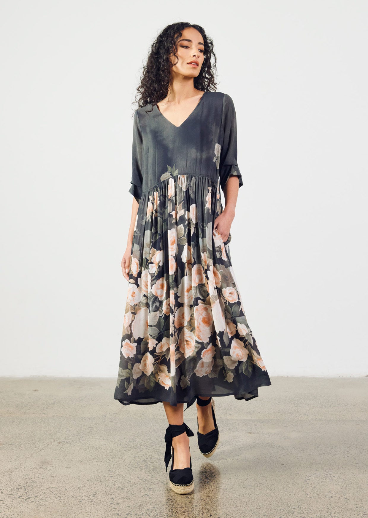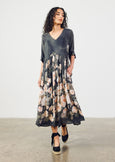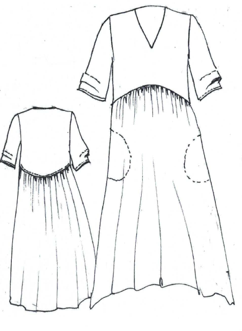 Flattering V neck, tucked ¾ sleeves, curved waist seam & gathered skirt. Back length 138 cm.