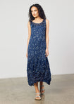 Sleeveless singlet dress with permanent vertical crush pleating to hip level & honeycomb scrunch pleating to hem. Back length 130 cm.