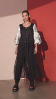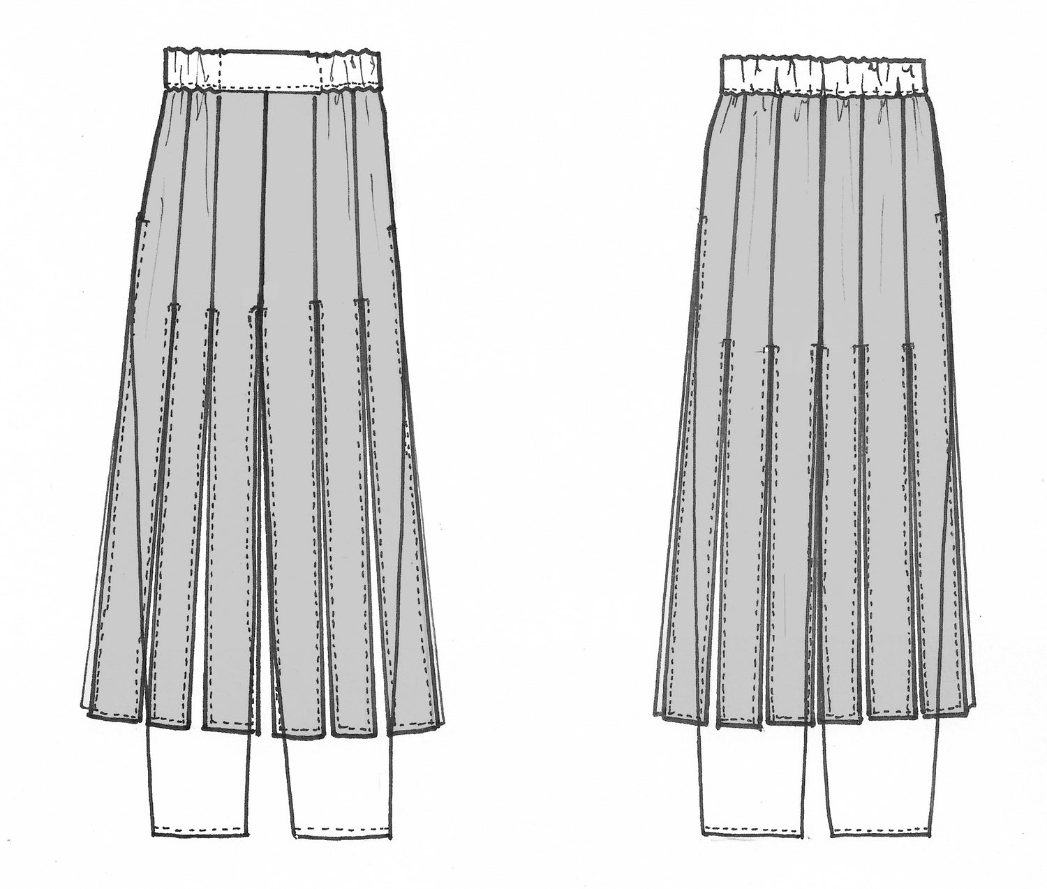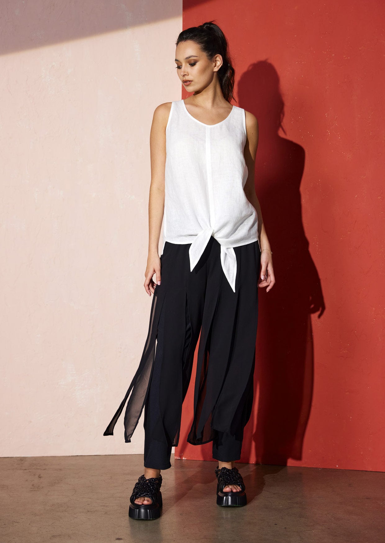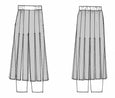 Narrow leg pant. Elastic waist with flat front sections. Overlay of silk georgette cut into strip panels front and back , attached at waist.