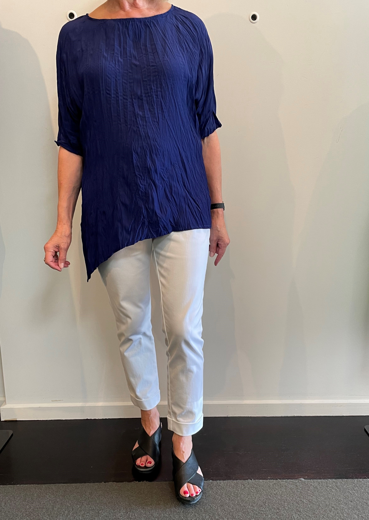 Slim fit with narrow leg. Full length. Fly zip front with single metal button. Fitted waistband with front pockets. Belt loops with plain back.