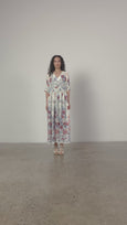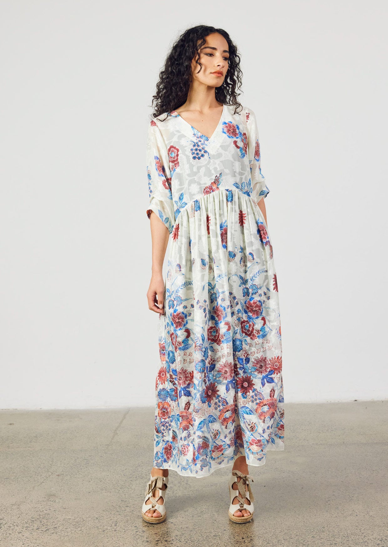 Flattering V neck, tucked ¾ sleeves, curved waist seam & gathered skirt. Back length 138 cm.