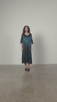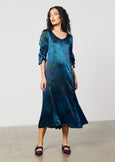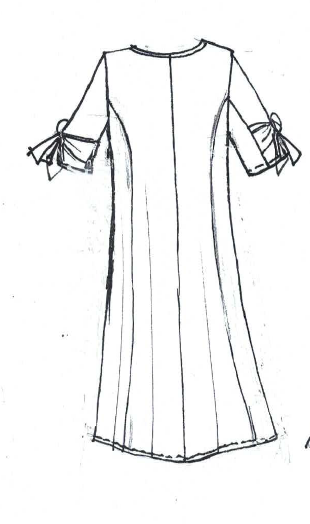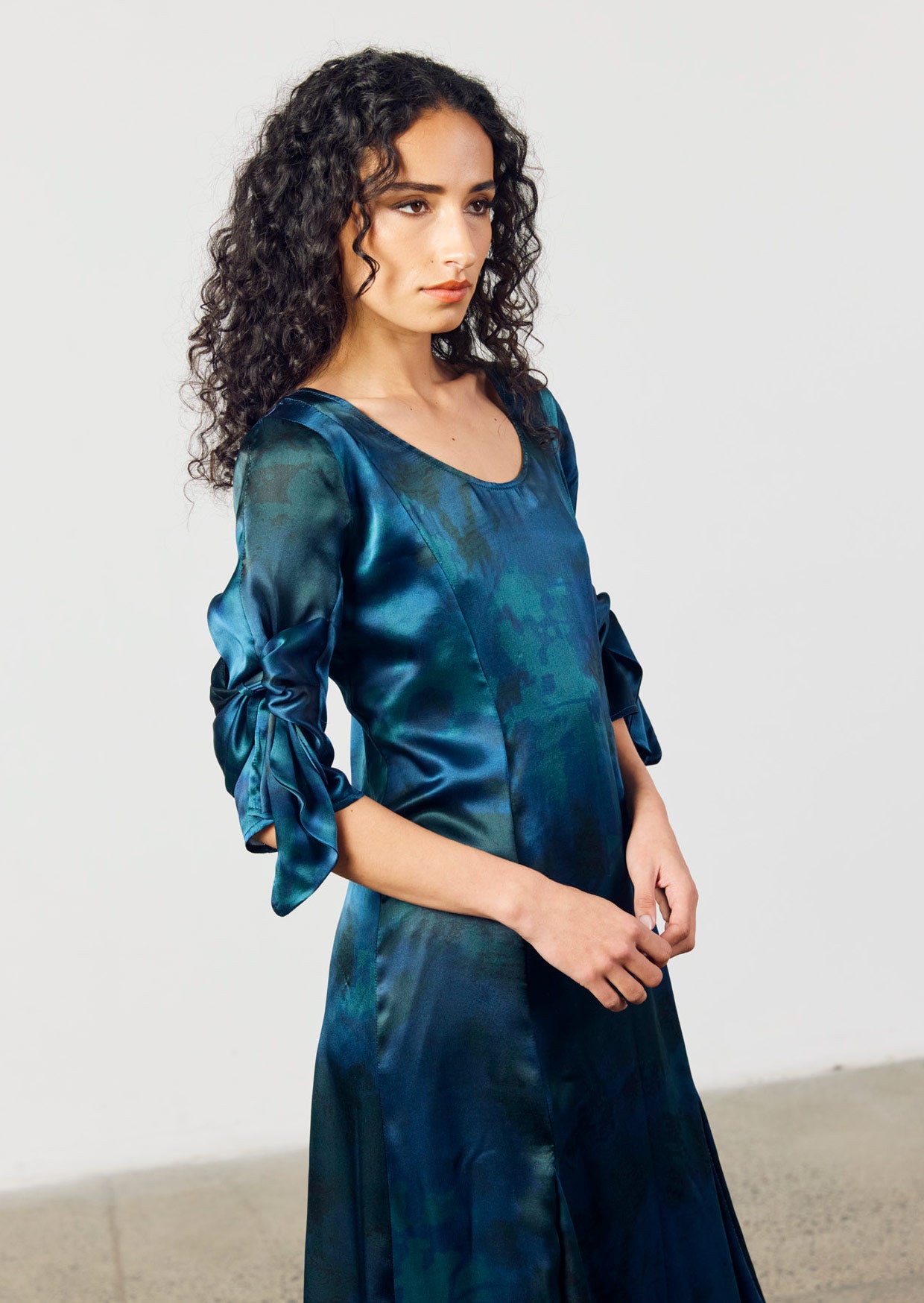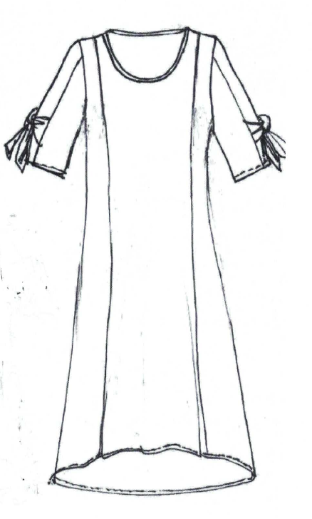 Scoop neck semi fitting dress with flattering princess seams & godets in skirt front & back. Feature self ties on ¾ sleeves. Back length 123cm.