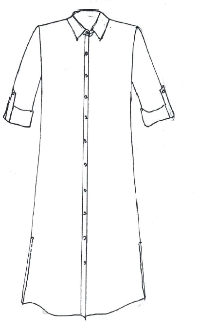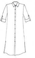Shirtdress with belt. Body skimming slightly A line shape. Regular shirt collar on stand. Roll up ¾ sleeve secured with tab & button. Self belt. Back length 123 cm.