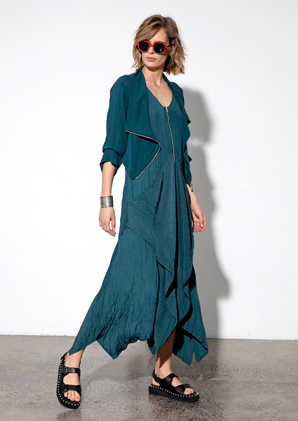 Short jacket with angled front zip closure. 3/4 sleeves with tuck detail.