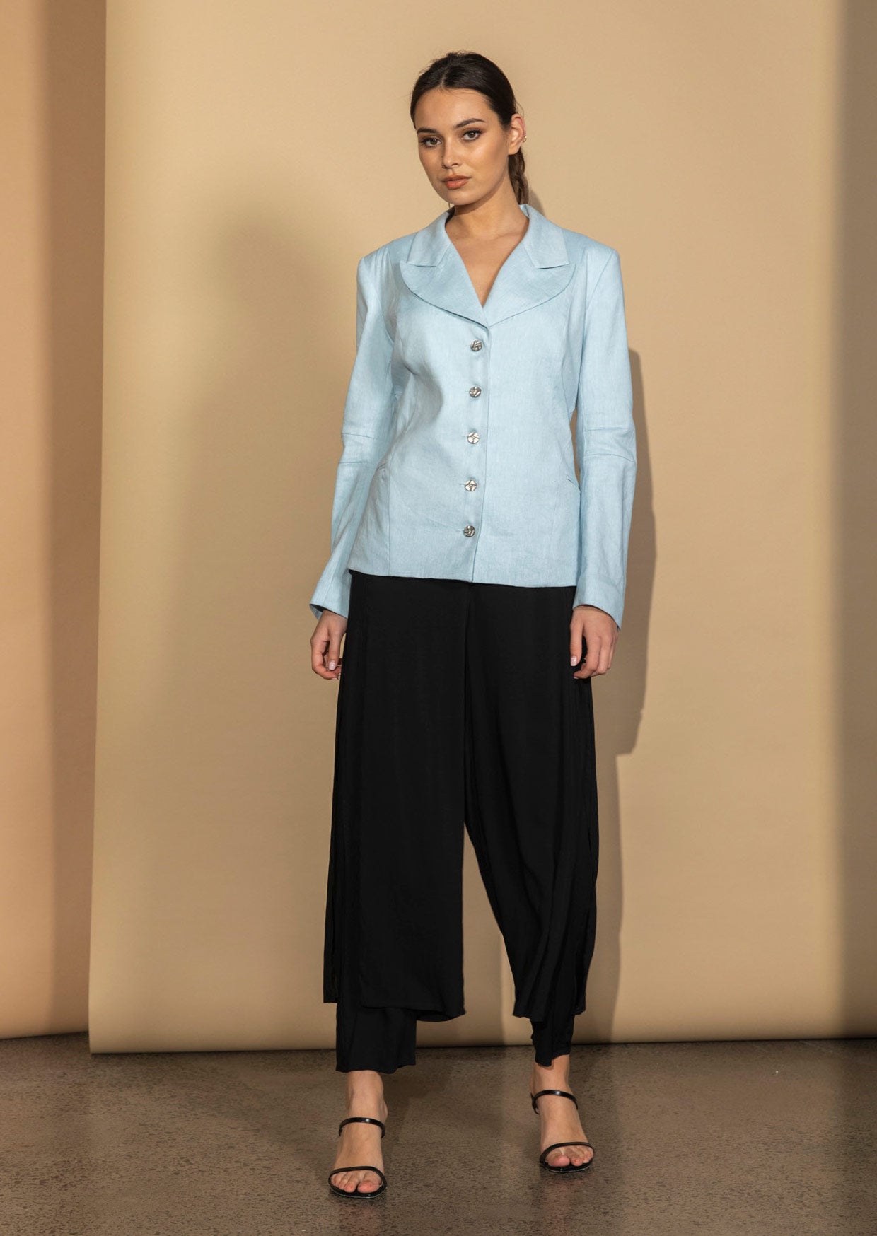 Full length pant with double layer. Regular fit with flat front waistband and elasticated back. Drapey outer layer has side splits.