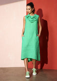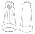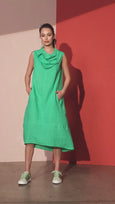 Midi length A-line dress with looped strap feature on low cow neck. Sleeveless, pockets.