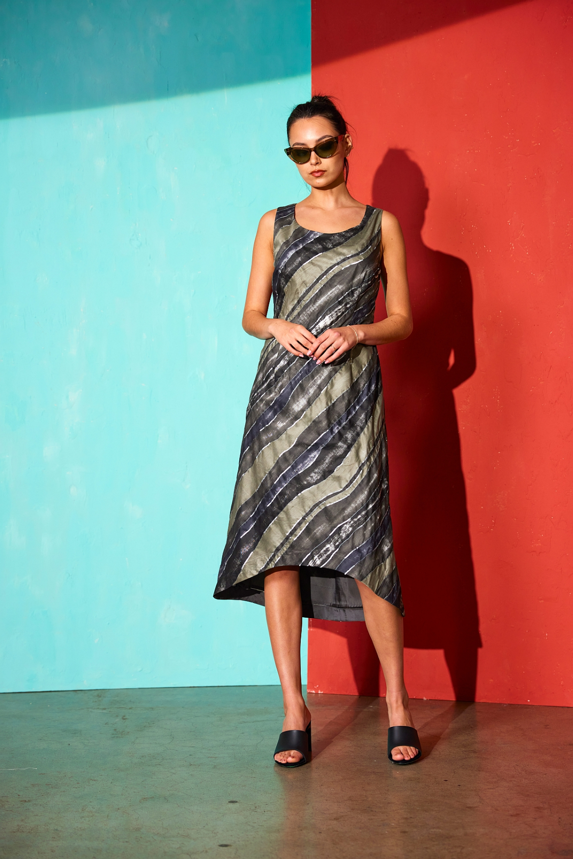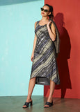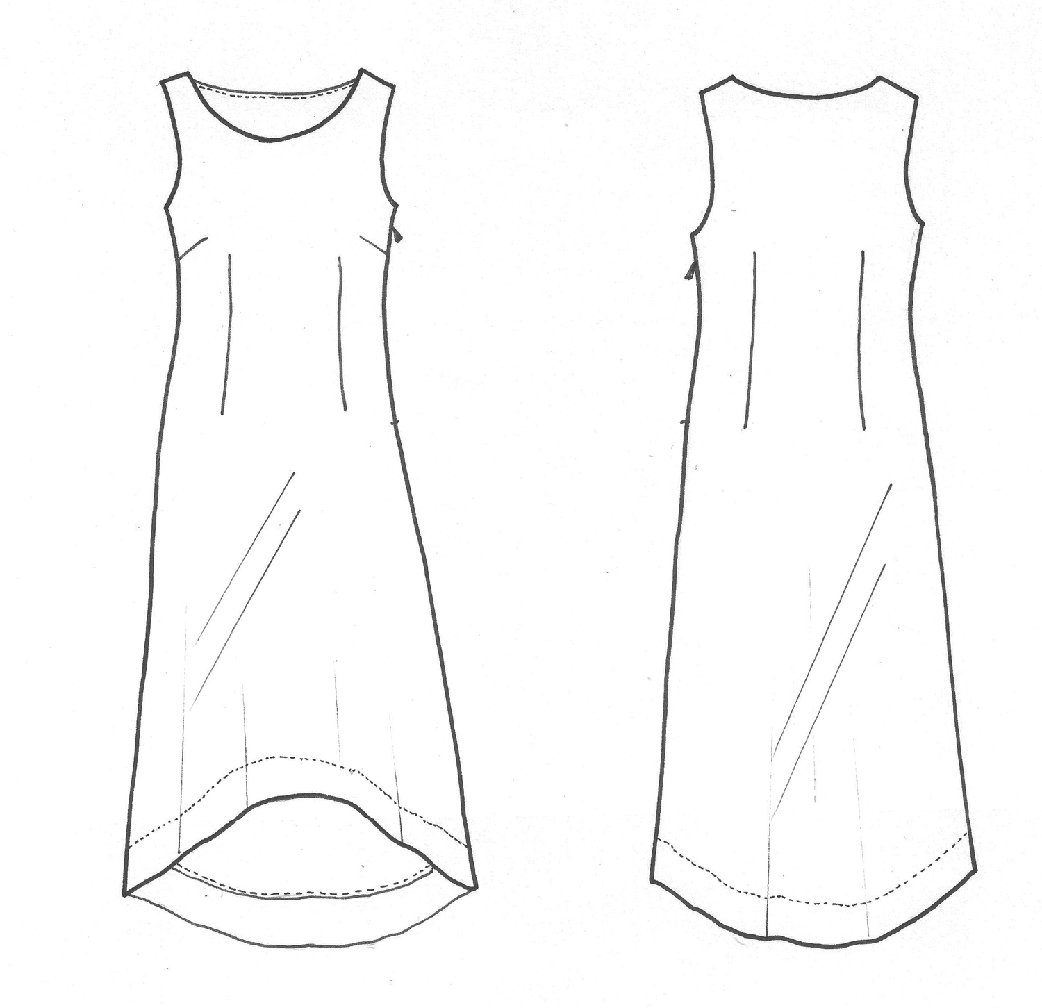 Fitted Sleeveless dress. Bias cut. Front length below knee and lower at back, Fully lined.