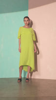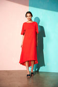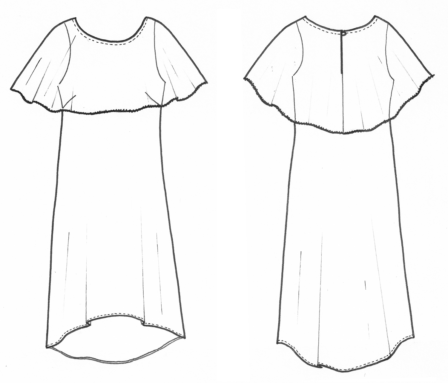 Midi length. Skimming shape dress. Fully Lined. Round neck. Built in cape over shoulders joined to dress at bound neck. Long high low hem. Cape to just above elbow scoops down lower at the back.