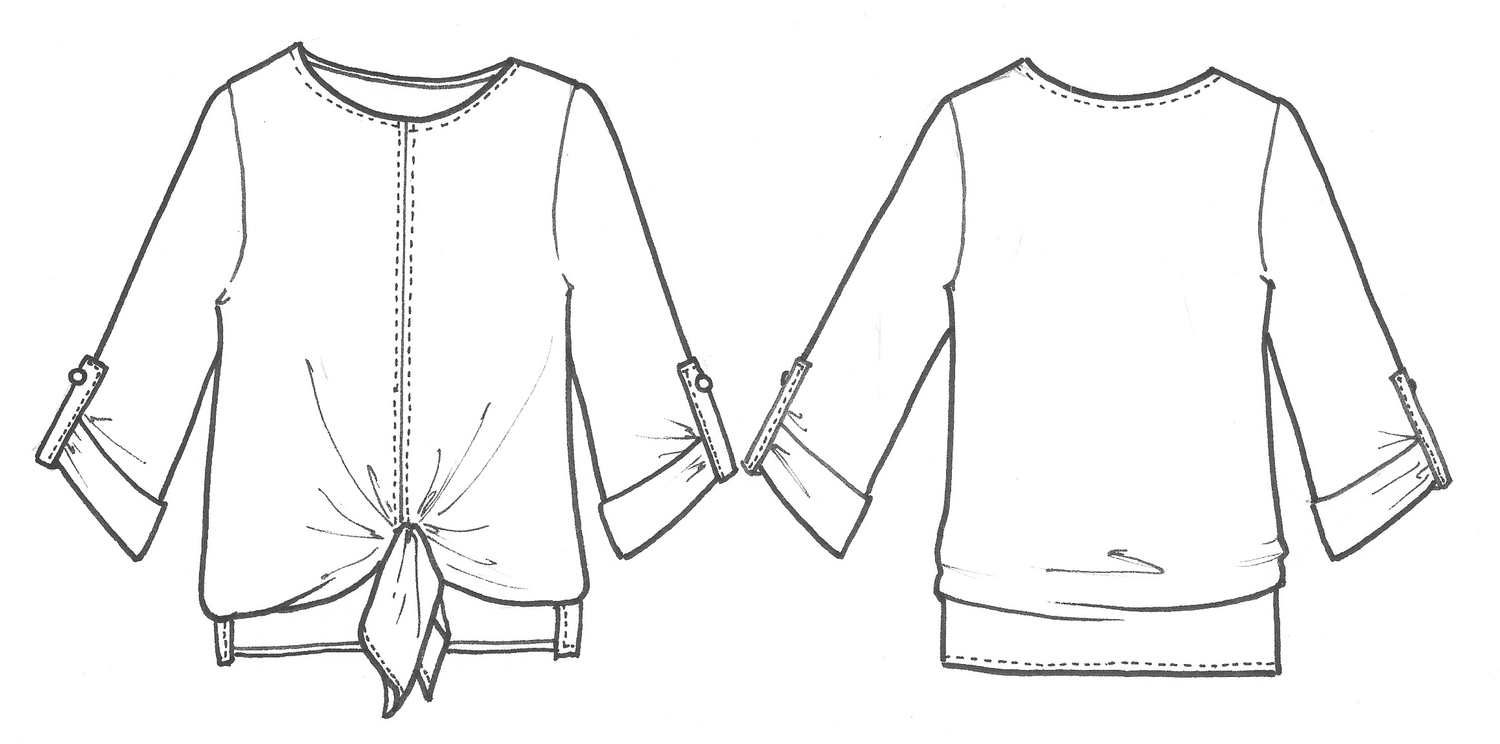 Relaxed fit silk top with scoop neck, center front seam with top-stitching, 3/4 length sleeves with tab. Front ties.