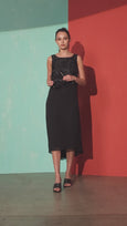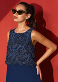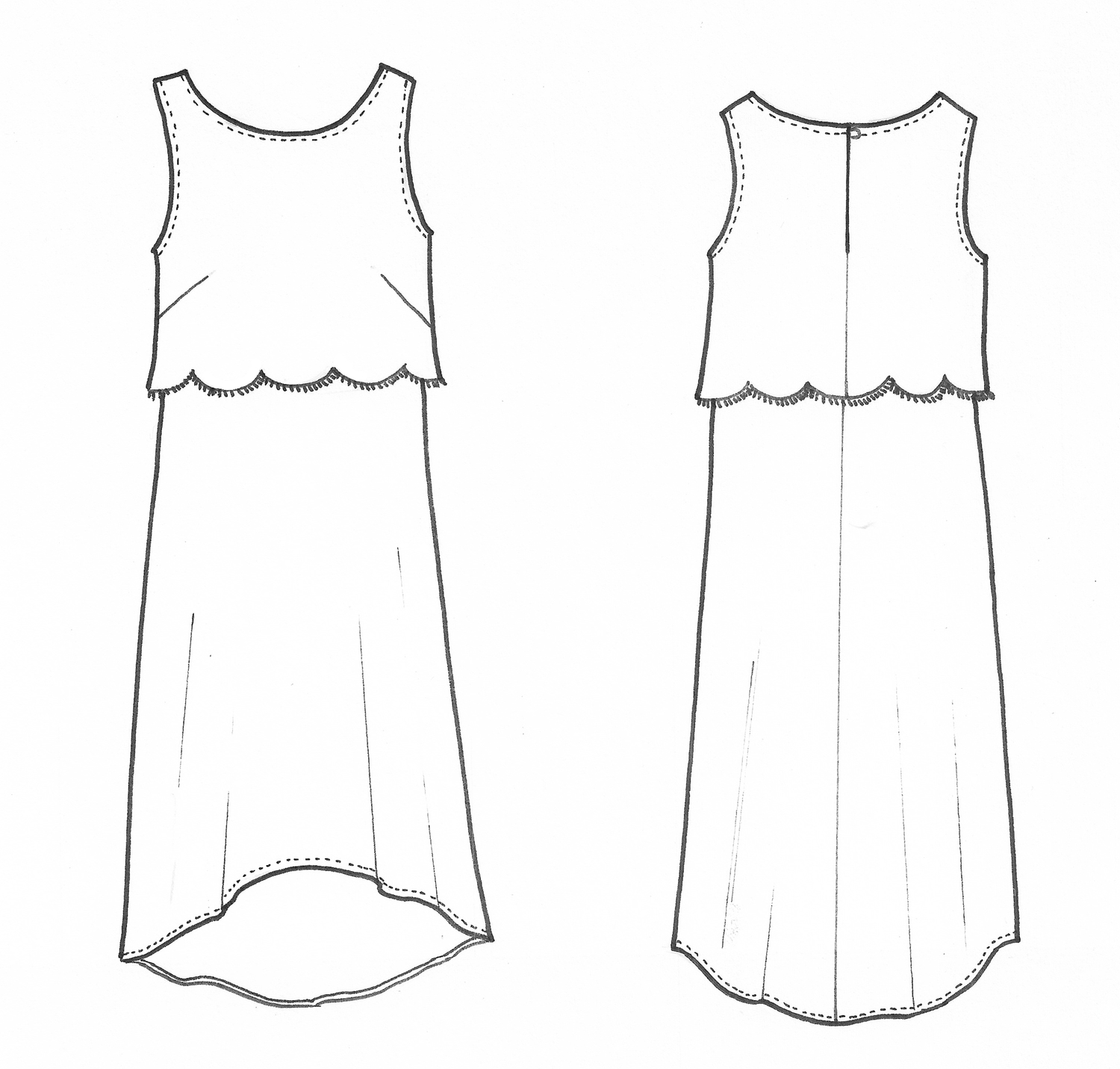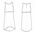 Sleeveless dress with overlay in scalloped french lace. Body skimming shape. Fully lined. High low hem.