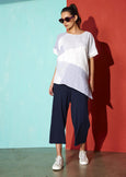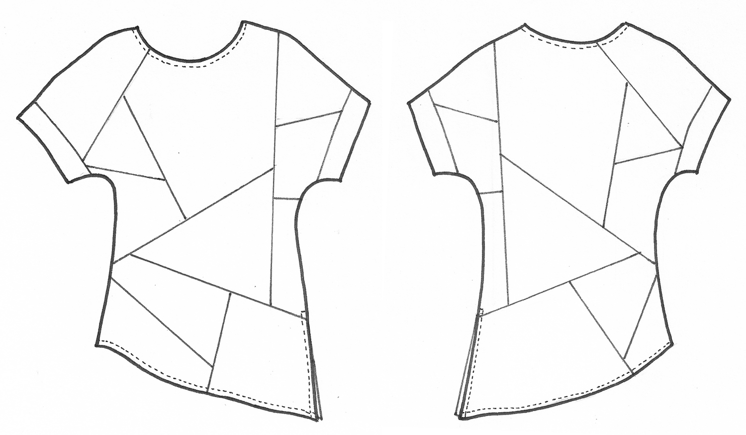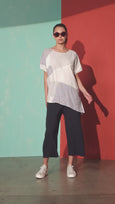 Dolman sleeve top with slanted hem, patchwork in Irish linen. Striped and plain