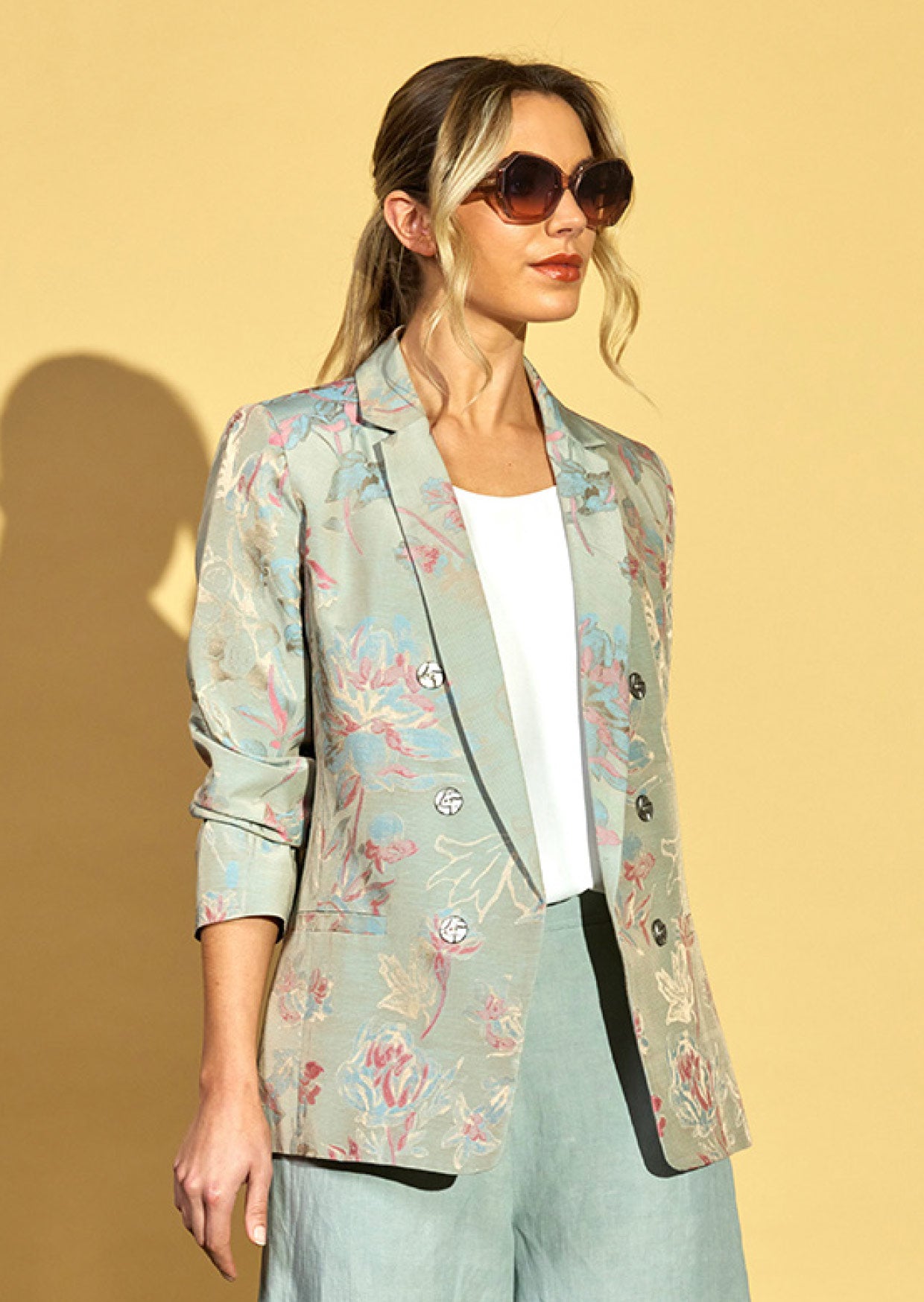 Timeless blazer with shaped panel seams and full Italian stretch lining. Edge to edge centre front with welt pockets and decorative non-fastening French button detail.