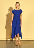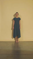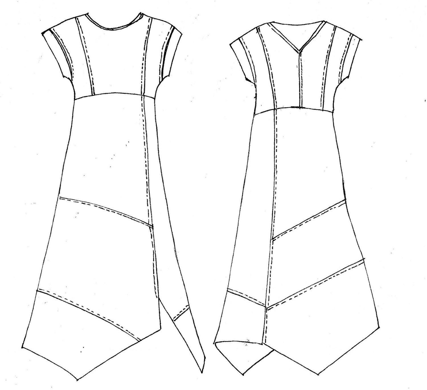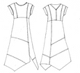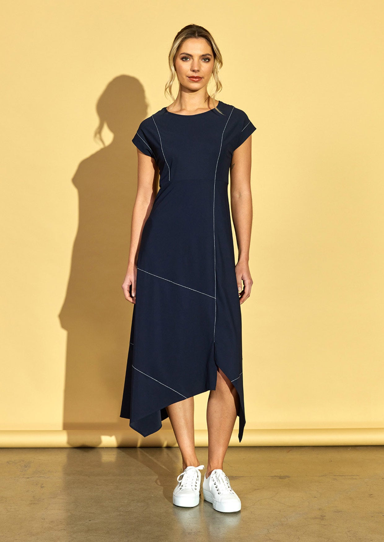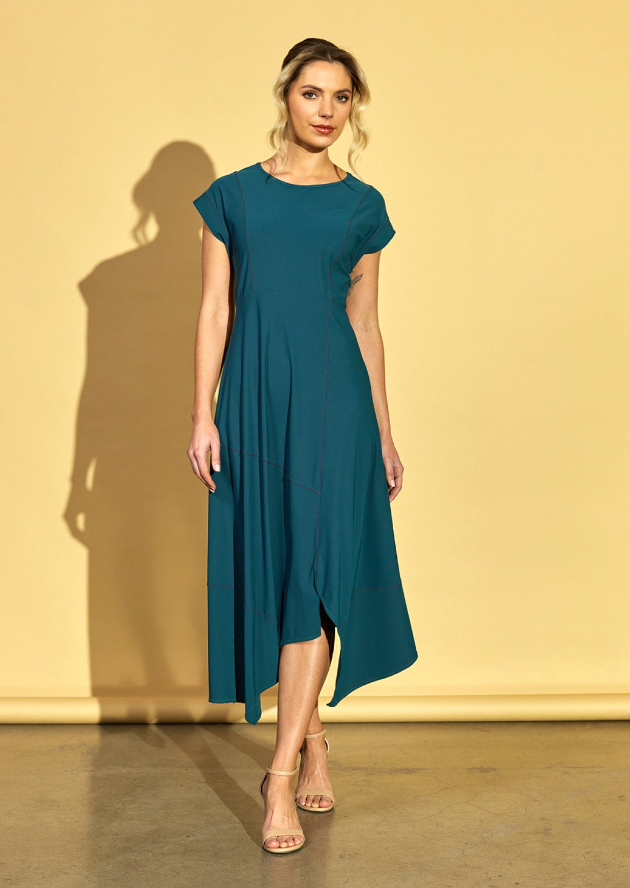 Eurojersey maxi dress with angled asymmetrical hemline, banded cap sleeve, flattering scooped empire line & V in back neck. Contrast top stitching on major seams.