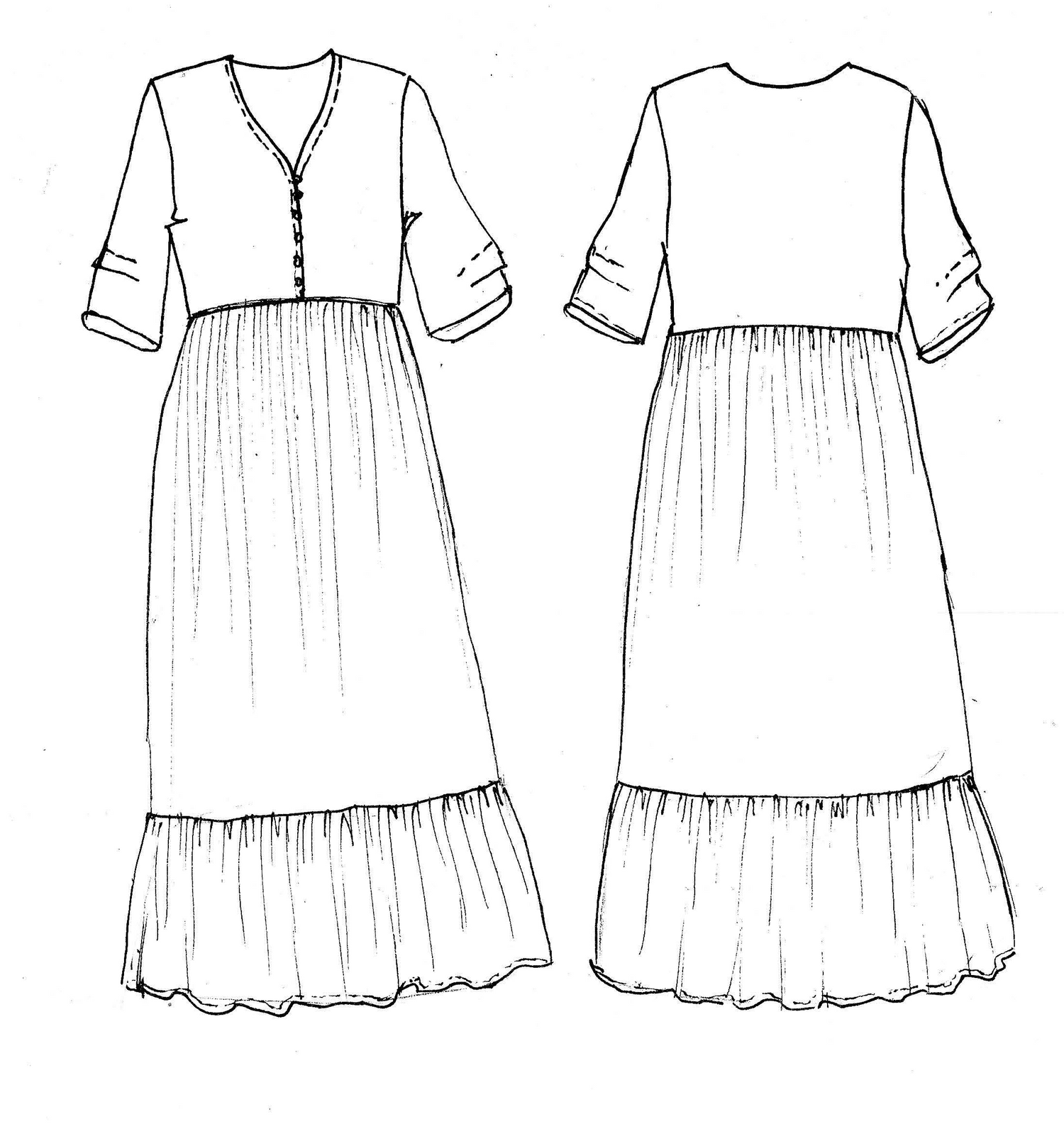 Long length dress with neck buttons & loops to empire line. Sleeves with tucks. Back Length 124 cm.