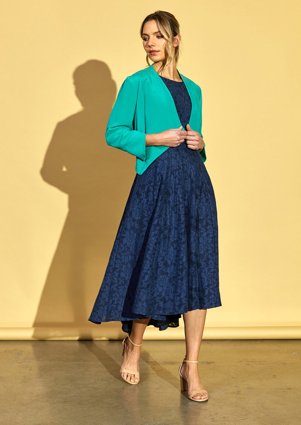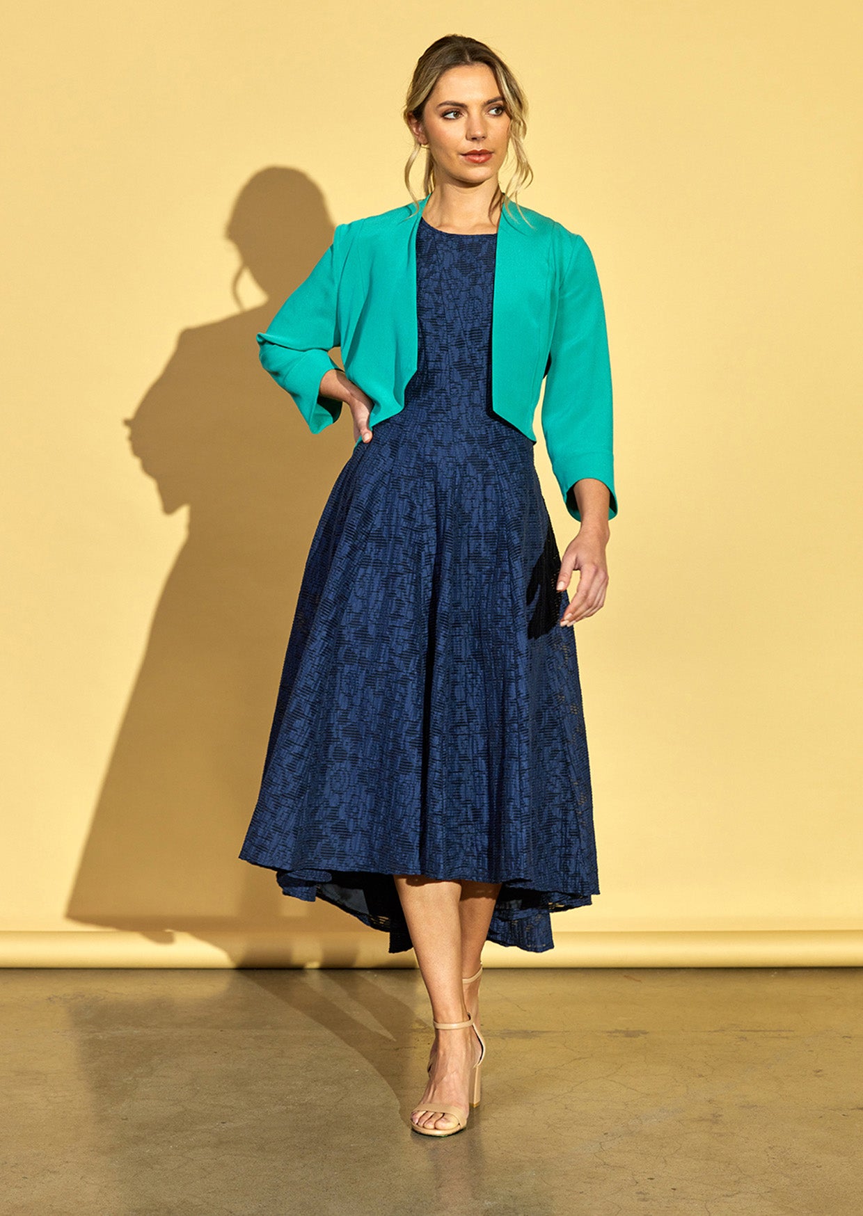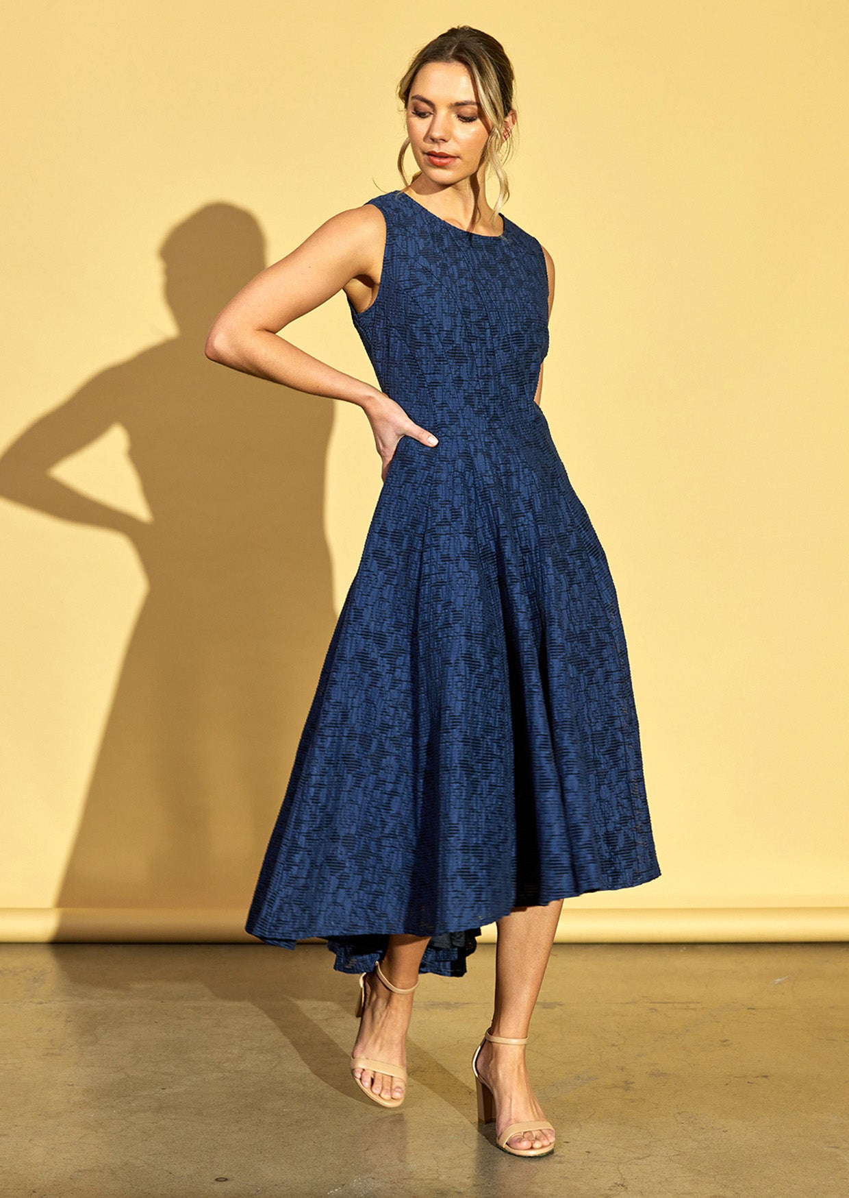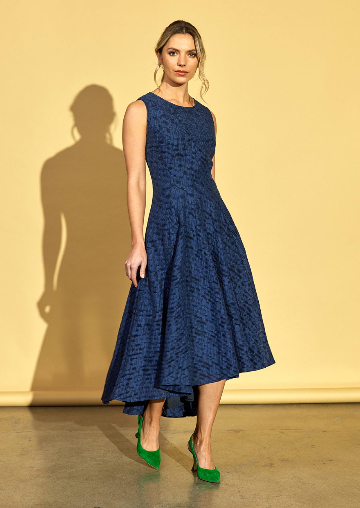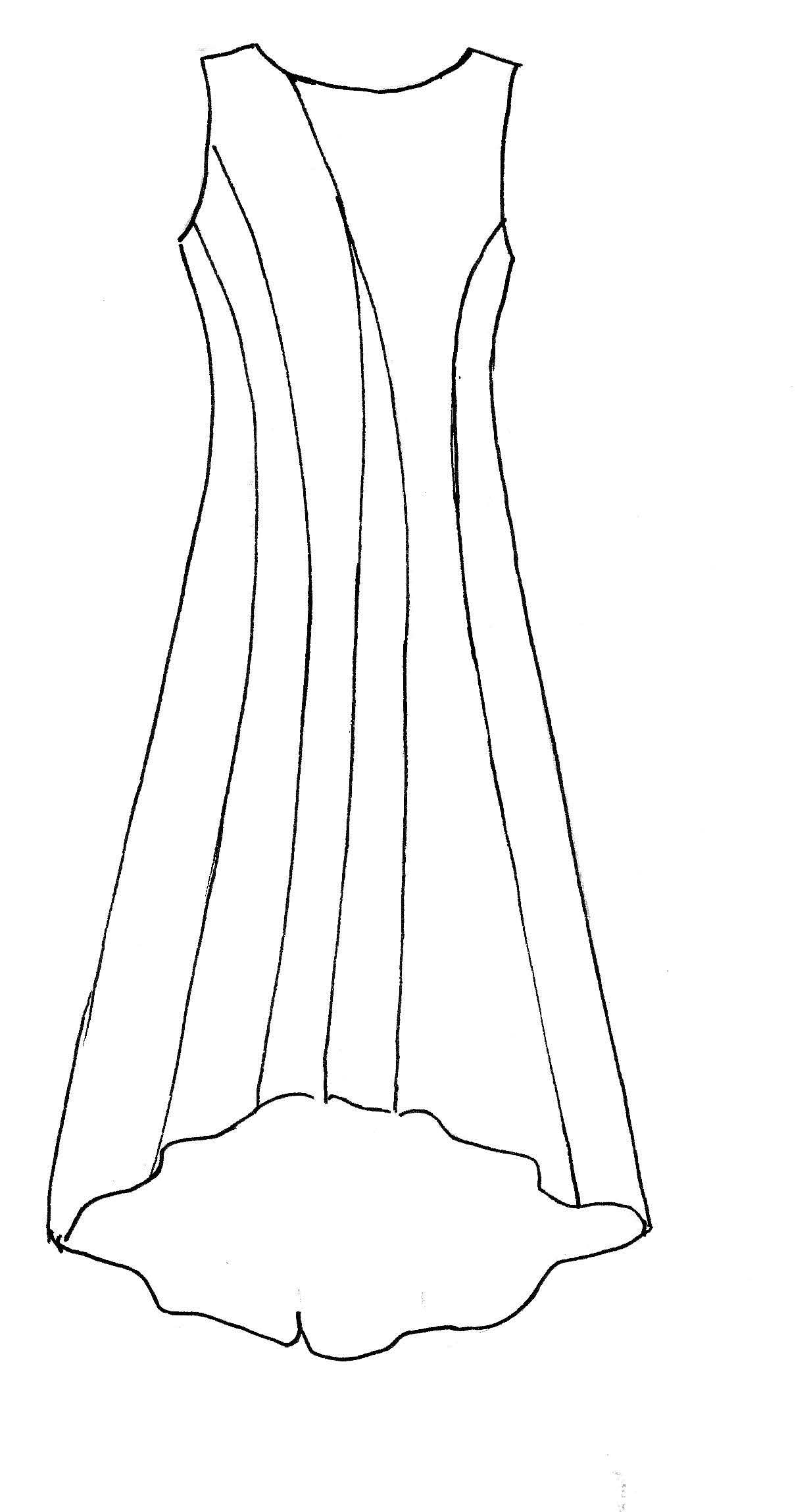 Very flared sleeveless fully lined dress with spliced irregular panels. Bodice fitted though torso, slightly cut away shoulder. Panels flare out just above waist. Centre Front length 108 cm. High low hem. Back length 132 cm.