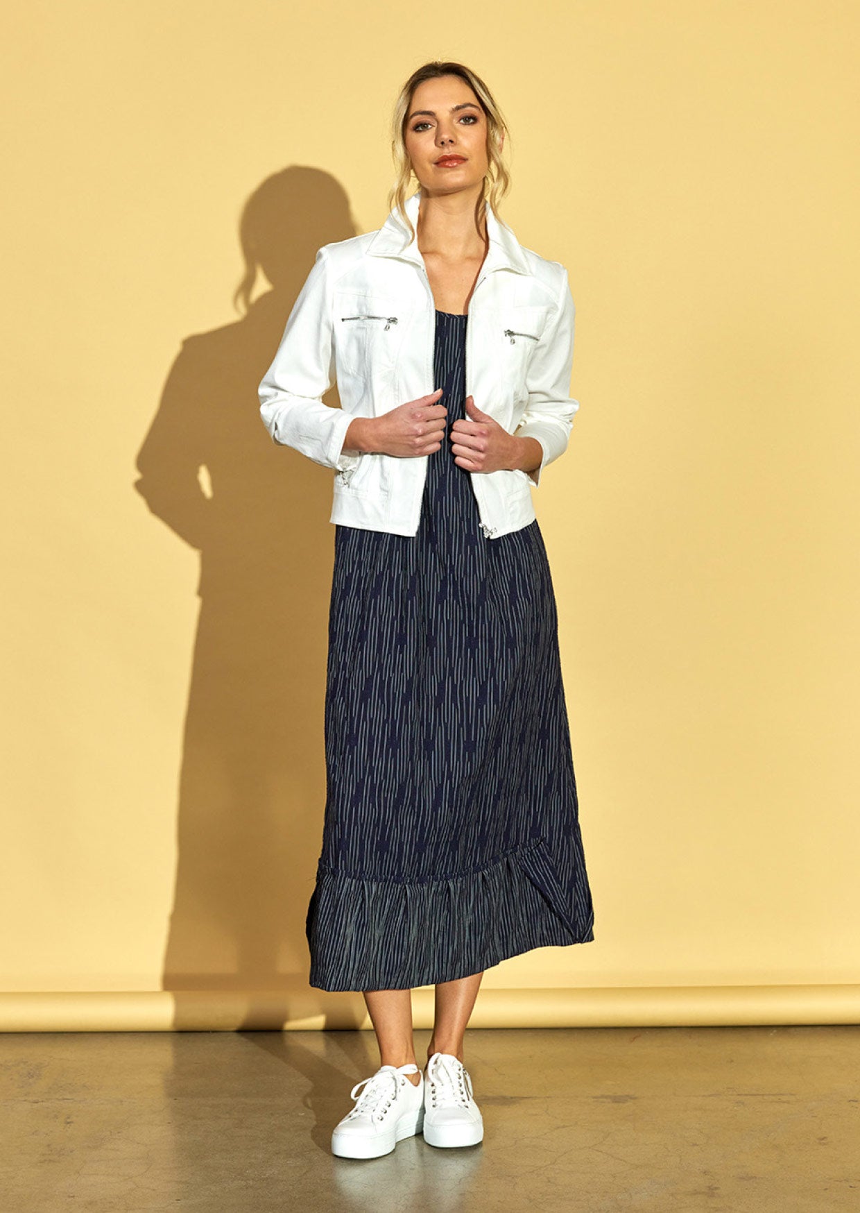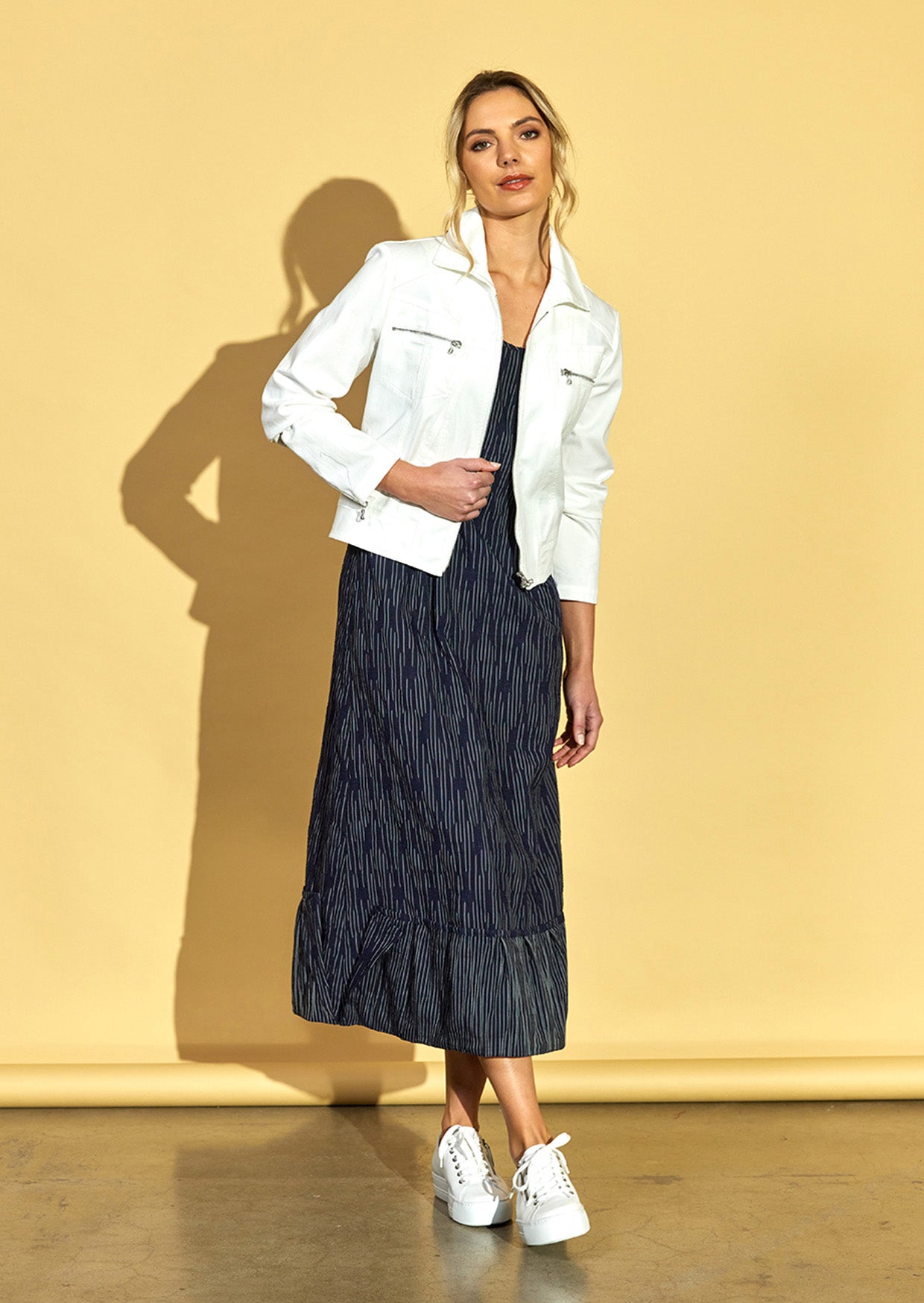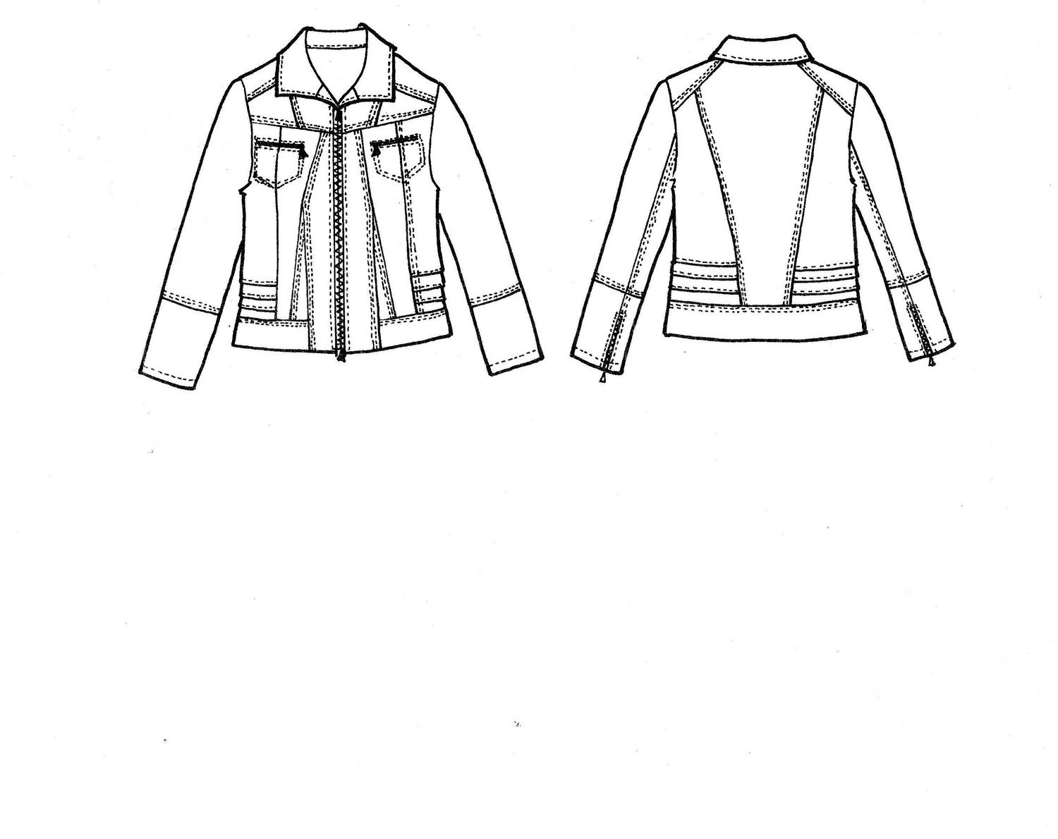 Hip-length battle jacket features double top-stitched angled seams & pin stitch detail. Metal 2-way zip front closure. Metal zips on breast pockets & cuffs. Back length 50 cm