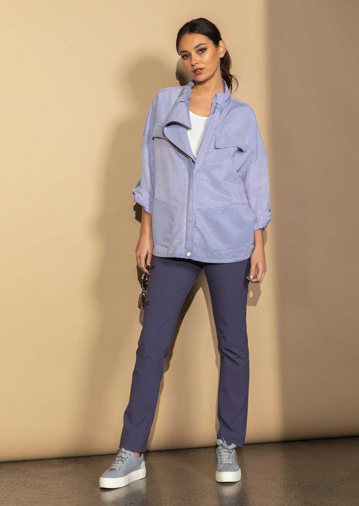 Loose relaxed fit, zip, angled front jacket. Dropped shoulder with 3/4 length sleeve with tab. Front hip pockets and faux breast pockets.
