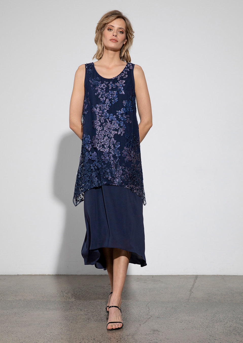 Double layered dress. Sleeveless, scoop neck, side seam splits. Hemline scoops down at the sides. Shorter layer over longer layer.