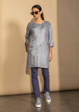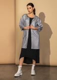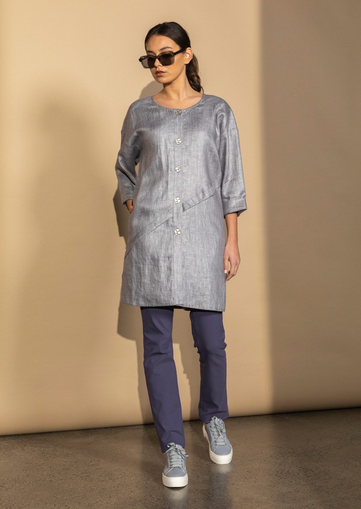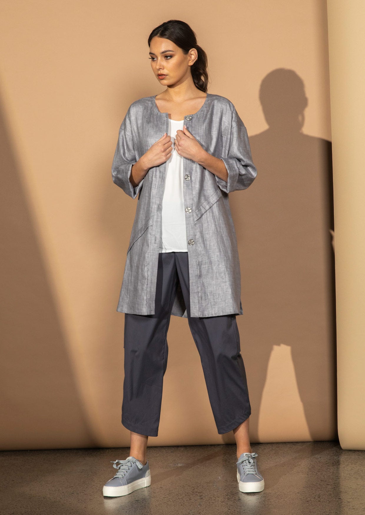 Relaxed fit, shirt jacket. Features extended shoulder, 3/4 length sleeve with tab, yoke and diagonal pleat through front and back. Round neck, French metal button front closure and side splits.
