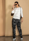 Relaxed fit, 3/4 length sleeve tee with dropped shoulder and boat neck. Featuring tone-on-tone appliqued linen strips front and back.