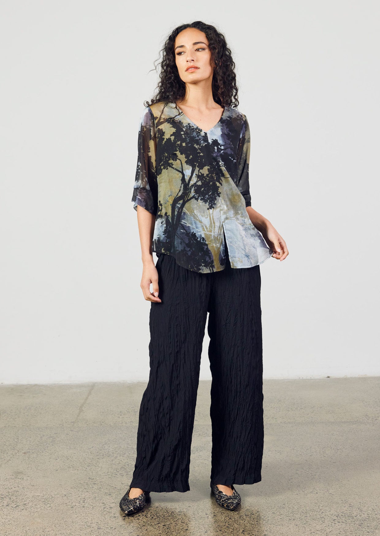 Flattering rounded V neck top with split at centre front seam & splits in side seam. Rounded shirt tails. Below length sleeves with tuck. Loose relaxed fit. Back length 62 cm.