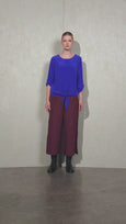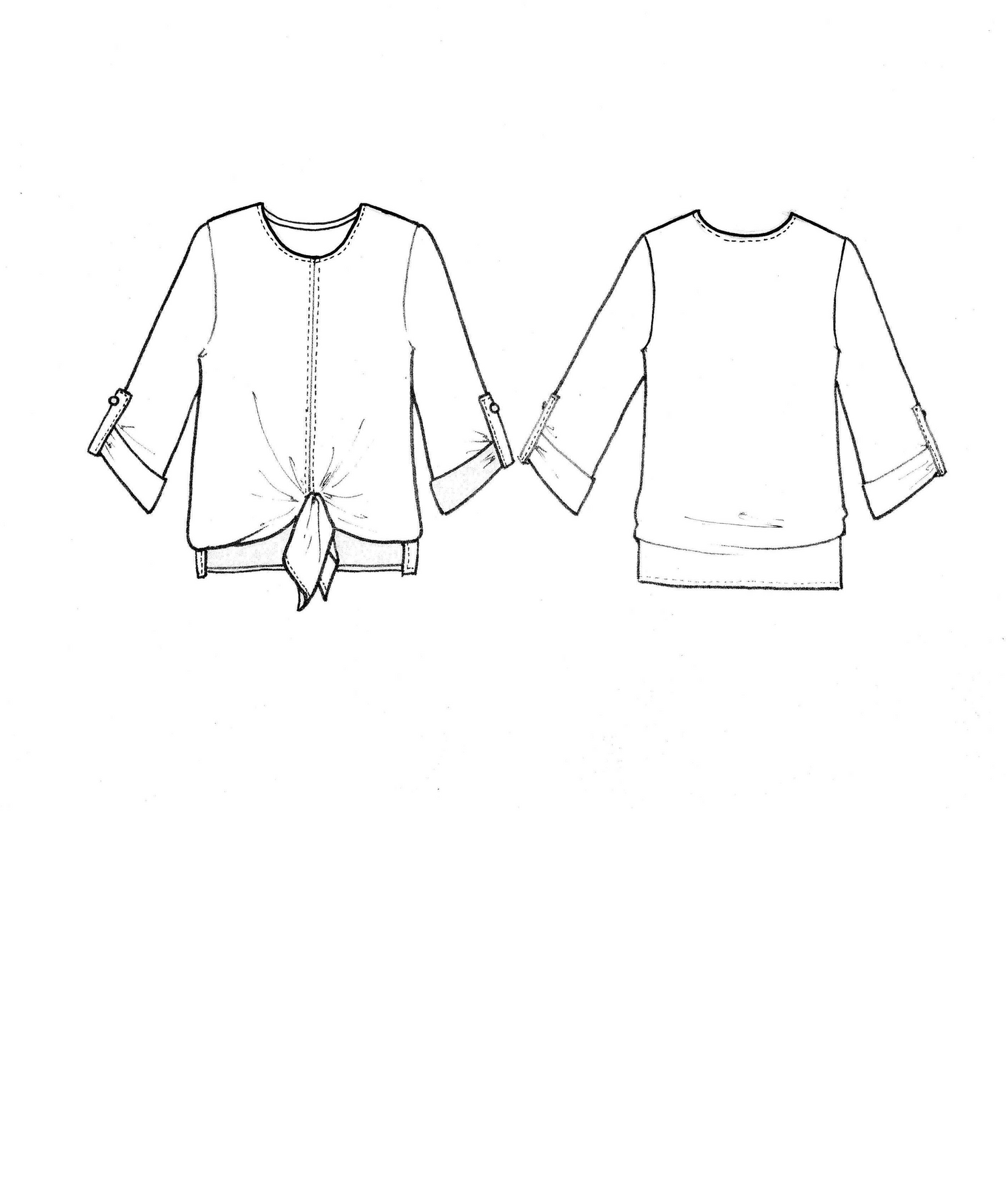 Sand washed Silk. Round neck top with centre front seam, front extends to form ties at front hem. 3/4 sleeve rolls up with tab & french buttons. Back length 61cm.