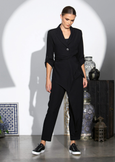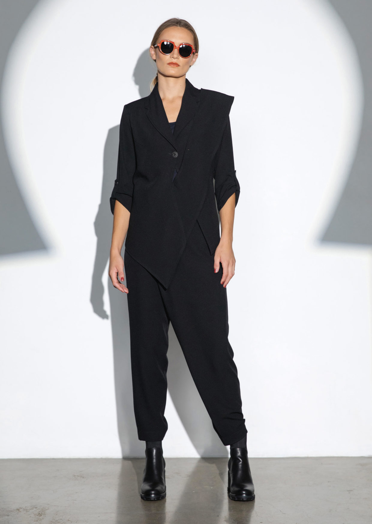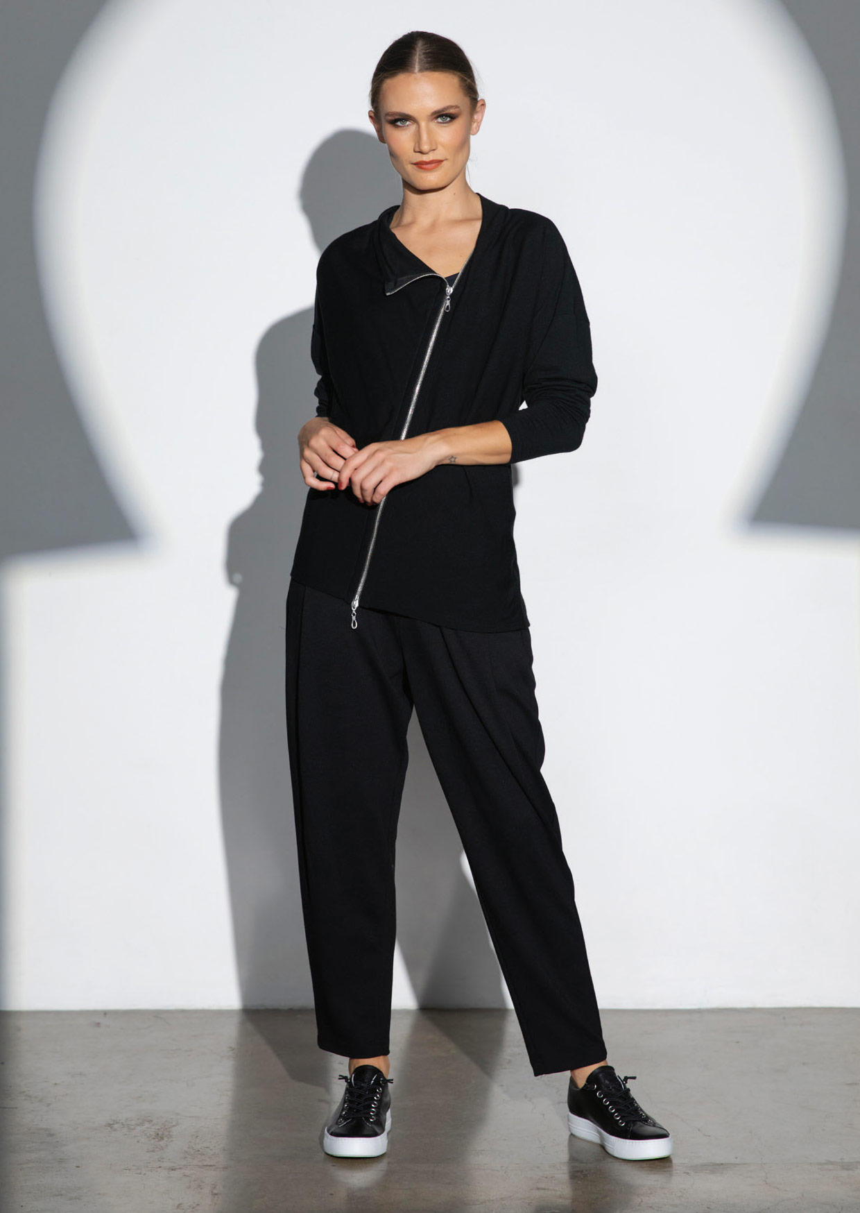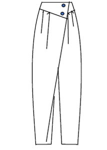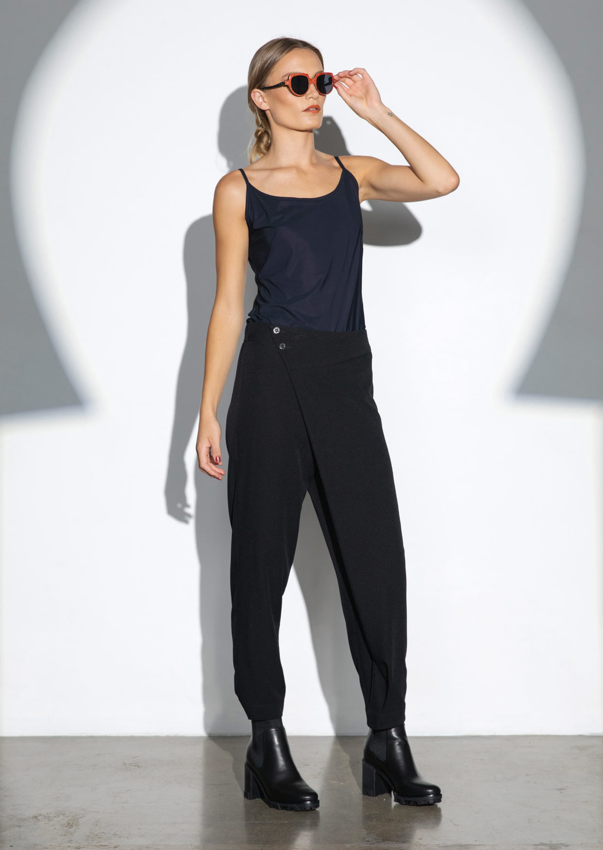 Angle length, relaxed fit pant. Features crossover wrap waistband with French metal buttons, invisible centre front zip, darts, half elastic waistband.