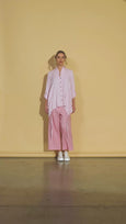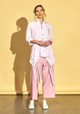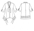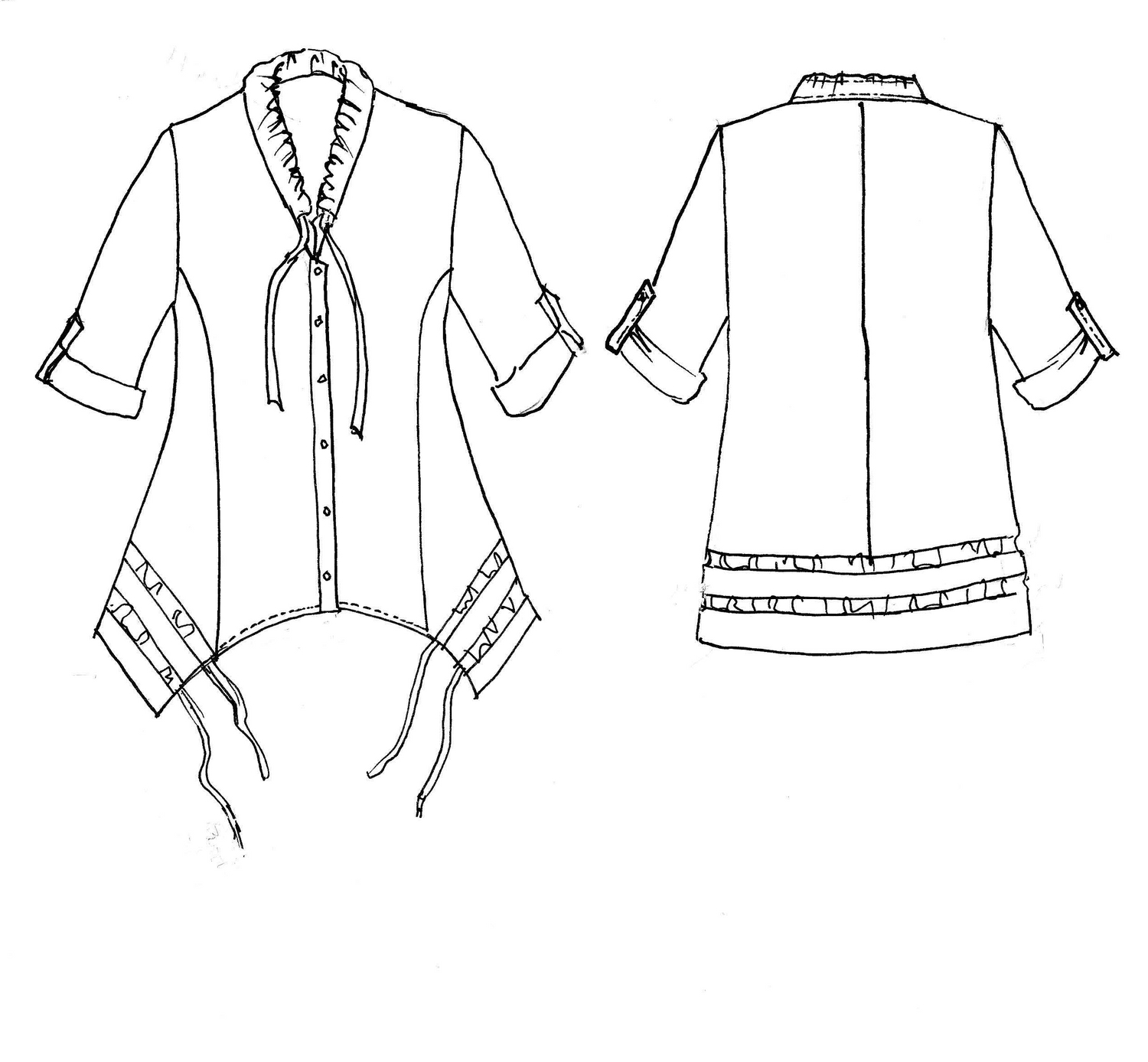 Drapey oversize look shirt, although hangs from a standard shoulder & set in sleeve. Rectangular panels in sides with self drawstring detail. Collar with self-drawstring. 3/4 sleeve roll up with tab & button. Front closure with french buttons. Front length from high shoulder point 68 cm.