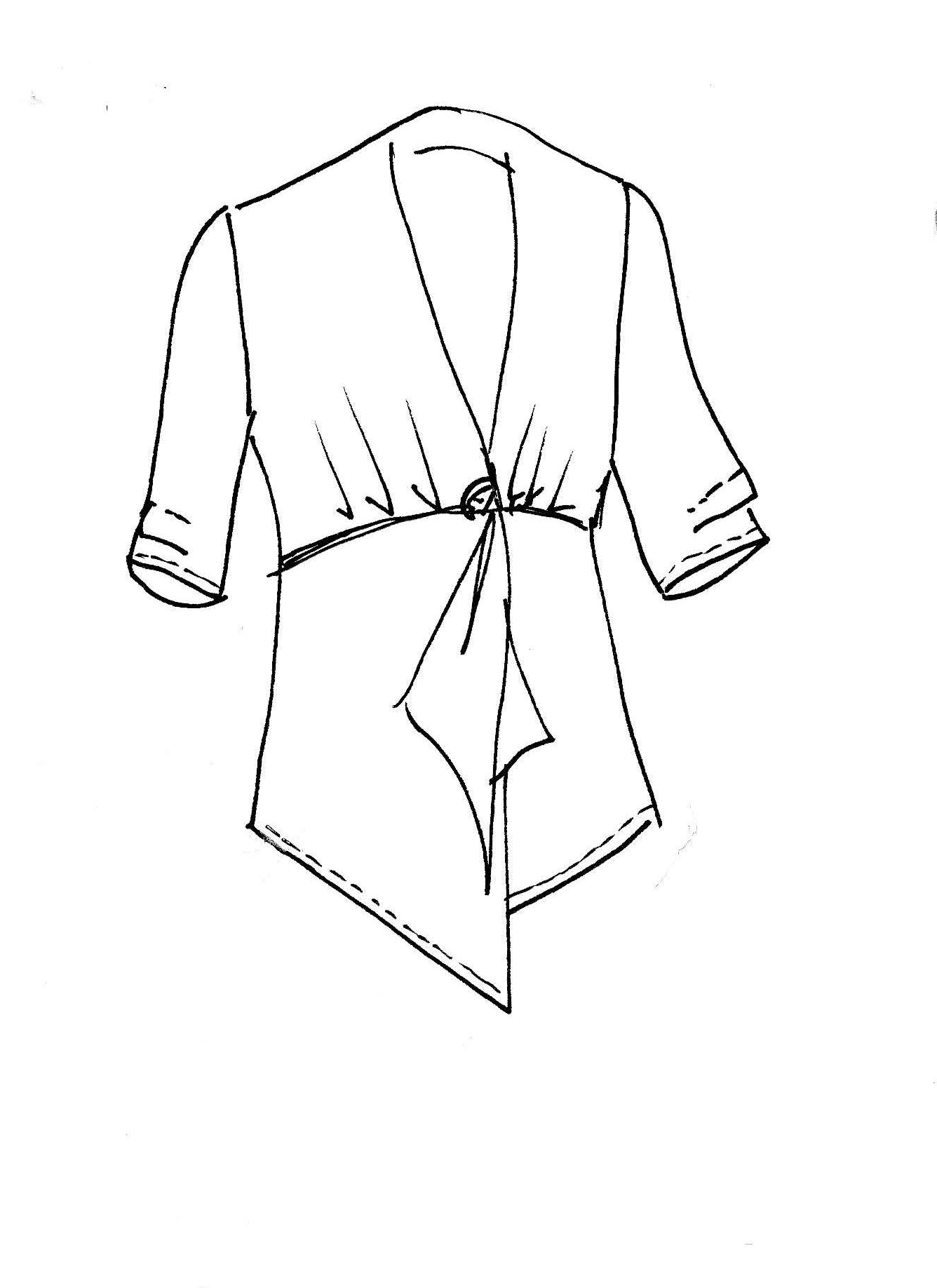 Unlined draped jacket designer piece forms scarf effect with pointed hems at front. Fastens with self covered dome. Elongating V neck. 3/4 sleeve has tucks. Relaxed fit. Has waist seam but skims the body. Back length 66 cm.
