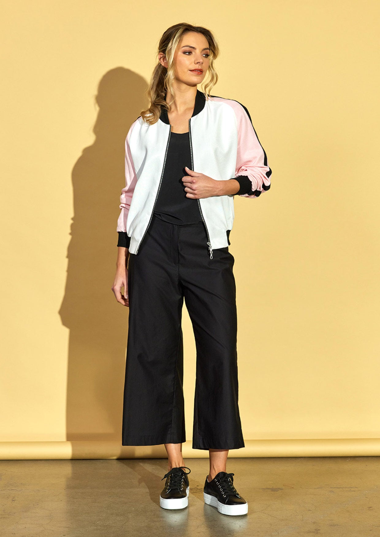 Relaxed fit, fully lined bomber jacket styled in a two colour combination, finished with black rib & a soft black grosgrain ribbon down the sleeves. Back length 60 cm.