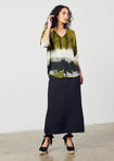 Unlined slightly A line long skirt. Side zip. Back vent shaped waist with darts. No waistband. Length 87 cm.