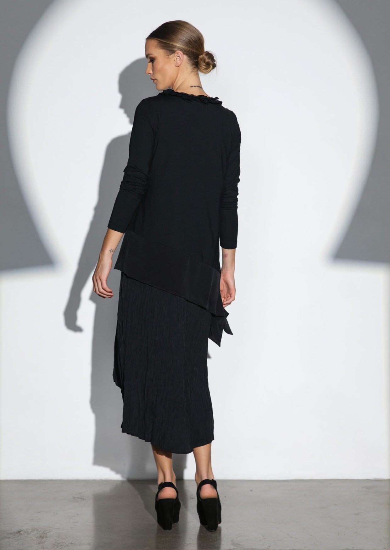 Relaxed fit knit top with full length sleeves. Features asymmetrical, ruffle neck interest and angled contrast hem band in sandwashed silk.